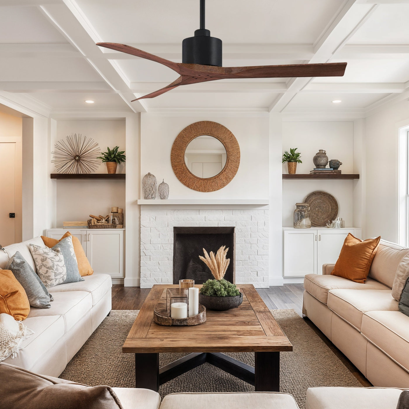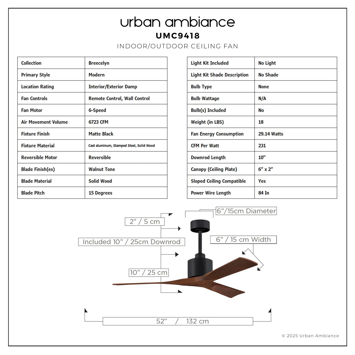 UMC9418 Modern Indoor/Outdoor Ceiling Fan, 12" (Plus Downrod) H x 52" W x 52" D, Matte Black Finish, Breecelyn Collection