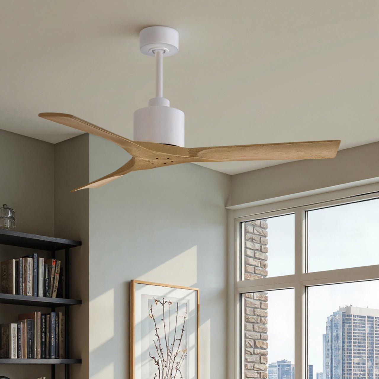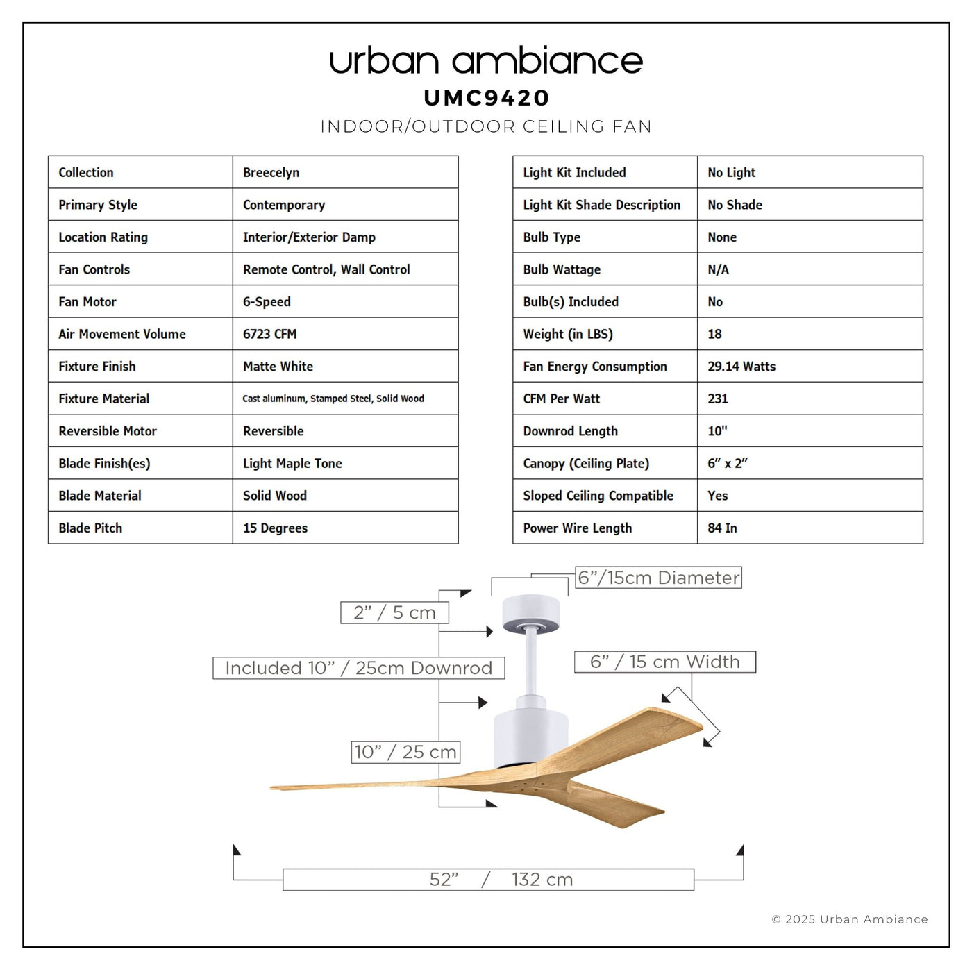 UMC9420 Contemporary Indoor/Outdoor Ceiling Fan, 12" (Plus Downrod) H x 52" W x 52" D, Matte White Finish, Breecelyn Collection