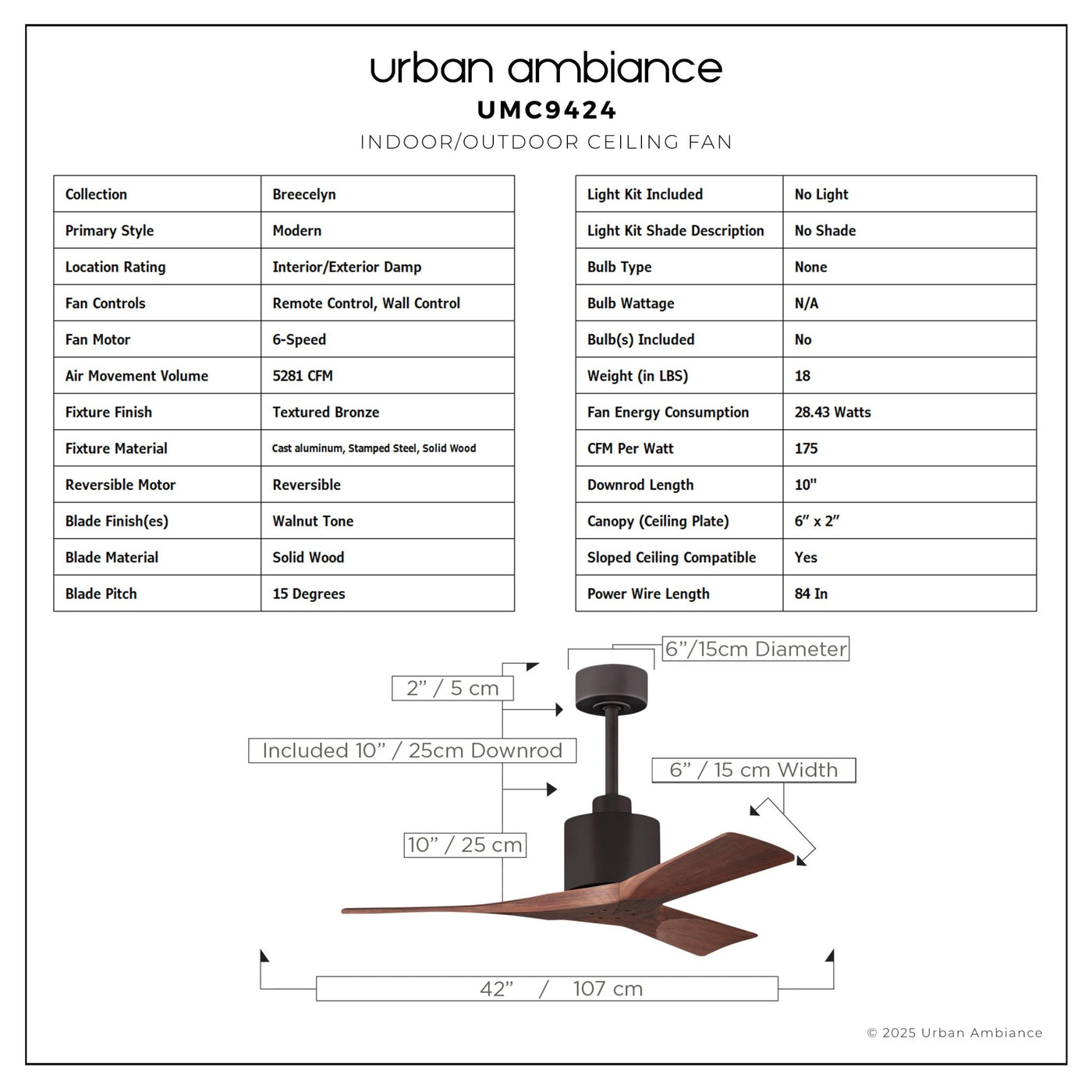 UMC9424 Modern Indoor/Outdoor Ceiling Fan, 12" (Plus Downrod) H x 42" W x 42" D, Textured Bronze Finish, Breecelyn Collection