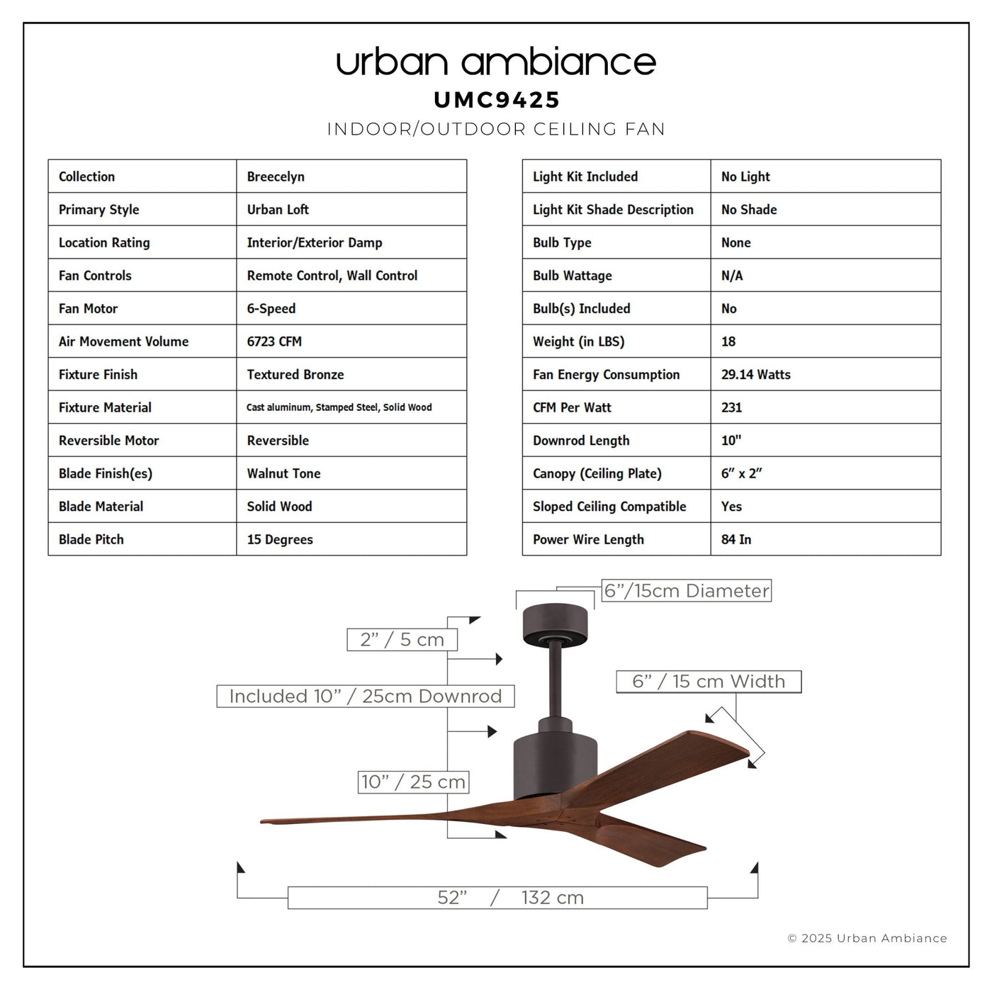 UMC9425 Urban Loft Indoor/Outdoor Ceiling Fan, 12" (Plus Downrod) H x 52" W x 52" D, Textured Bronze Finish, Breecelyn Collection