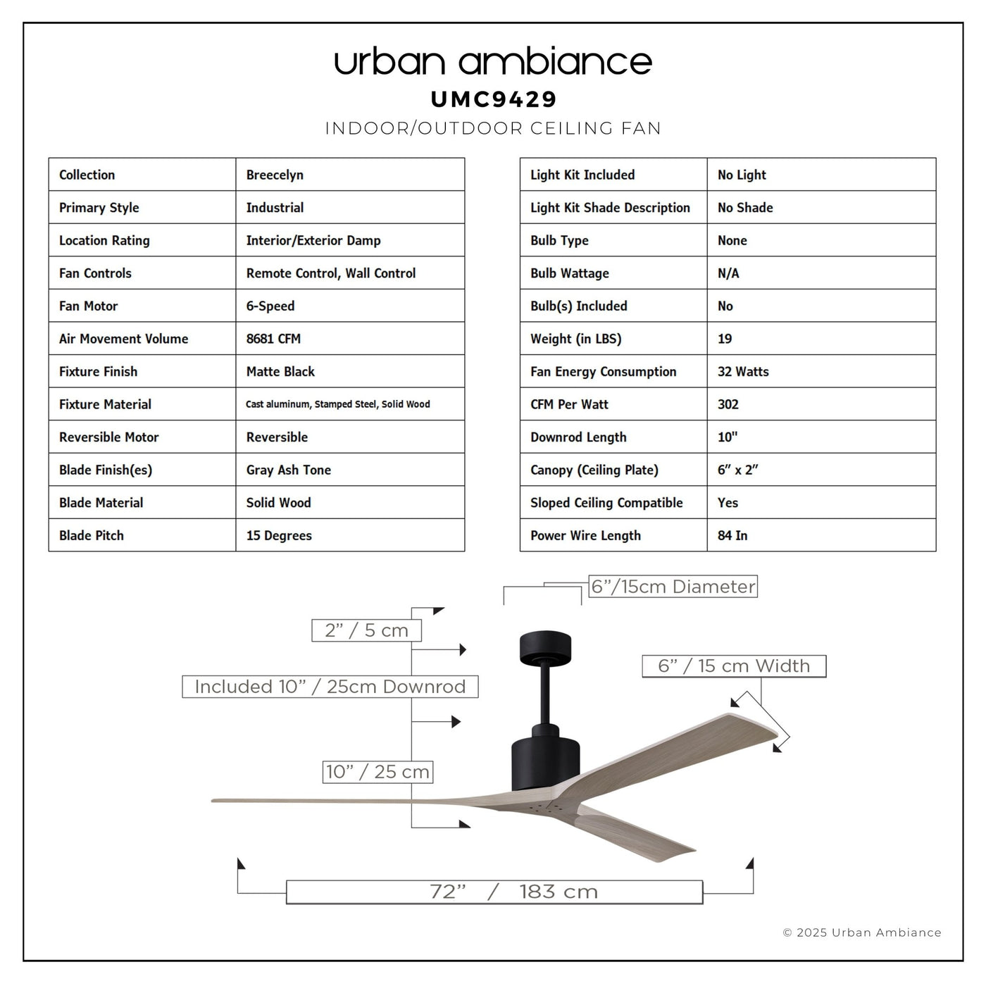 UMC9429 Industrial Indoor/Outdoor Ceiling Fan, 12" (Plus Downrod) H x 72" W x 72" D, Matte Black Finish, Breecelyn Collection