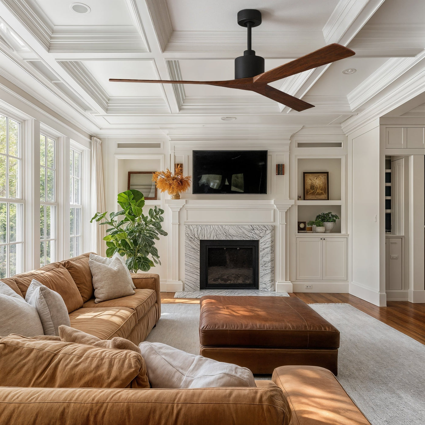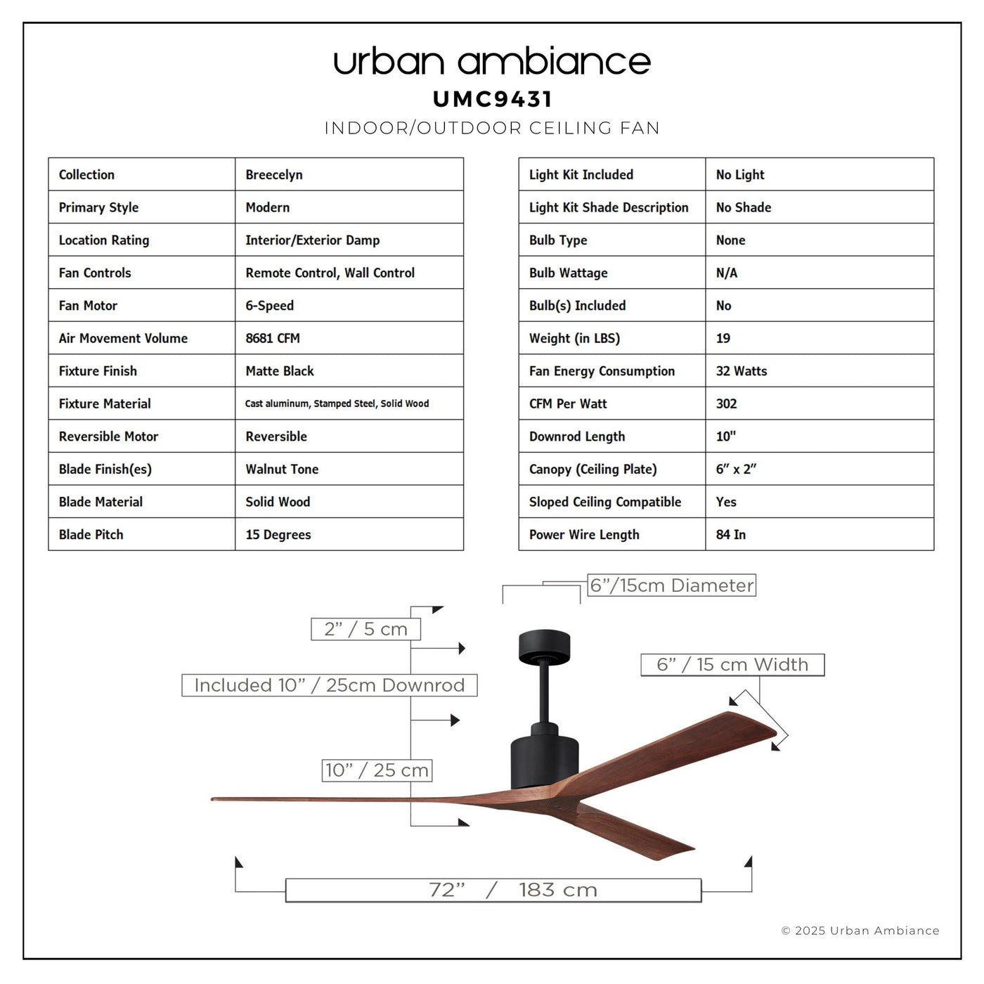 UMC9431 Modern Indoor/Outdoor Ceiling Fan, 12" (Plus Downrod) H x 72" W x 72" D, Matte Black Finish, Breecelyn Collection