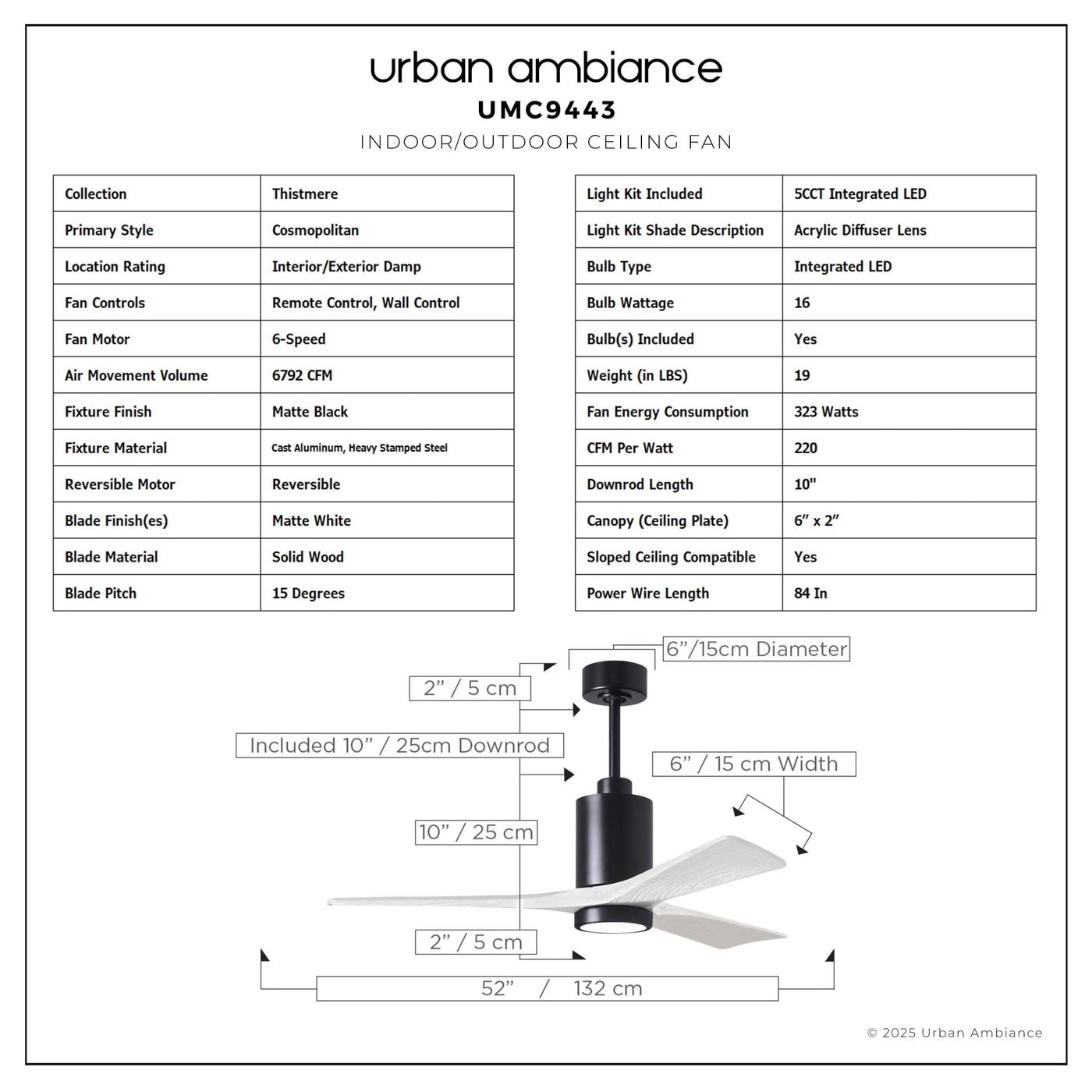 UMC9443 Cosmopolitan Indoor/Outdoor Ceiling Fan, 14" (Plus Downrod) H x 52" W x 52" D, Matte Black Finish, Thistmere Collection