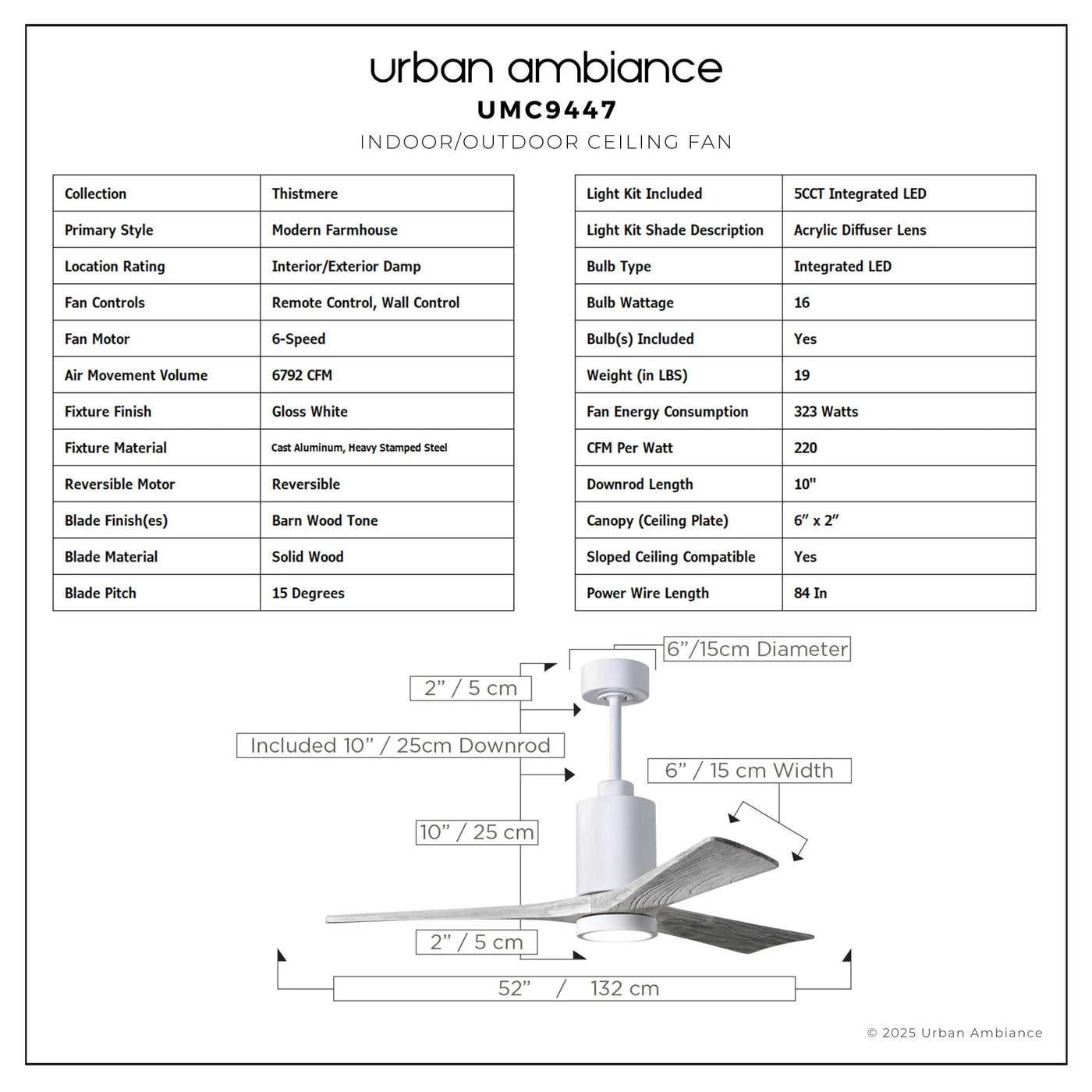UMC9447 Modern Farmhouse Indoor/Outdoor Ceiling Fan, 14" (Plus Downrod) H x 52" W x 52" D, Gloss White Finish, Thistmere Collection