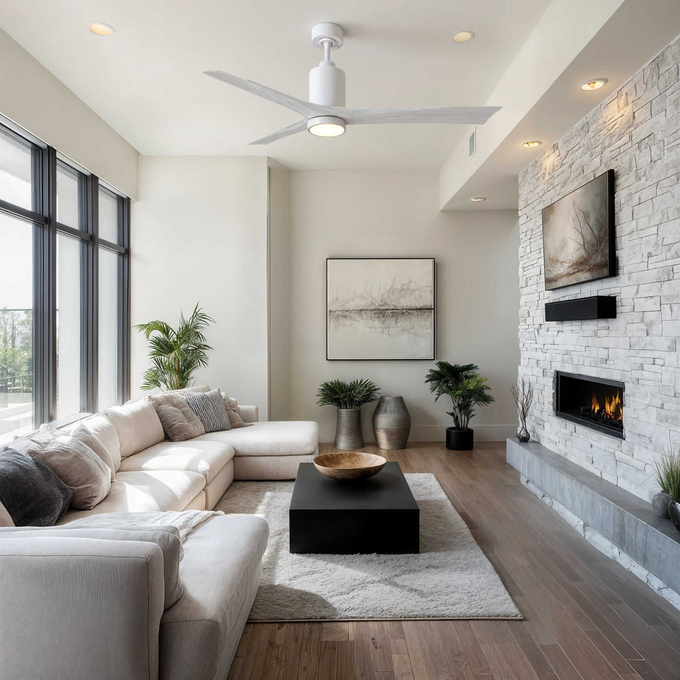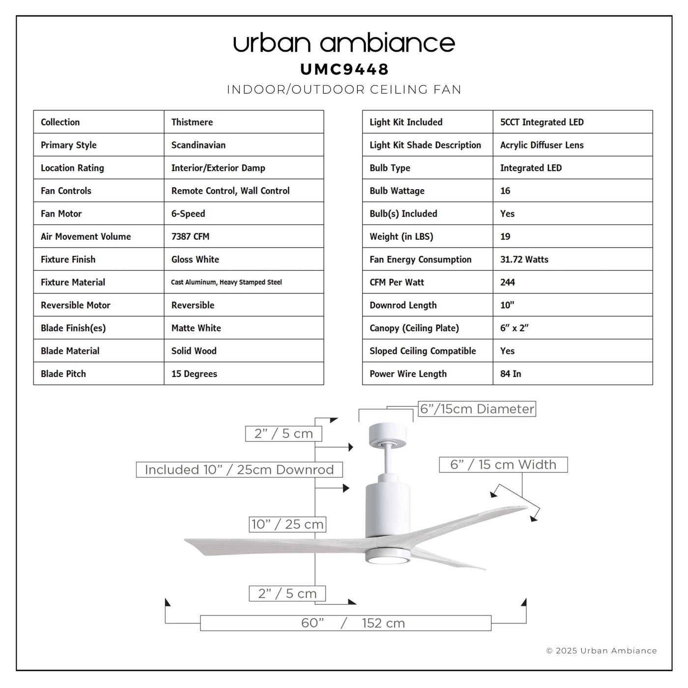 UMC9448 Scandinavian Indoor/Outdoor Ceiling Fan, 14" (Plus Downrod) H x 60" W x 60" D, Gloss White Finish, Thistmere Collection