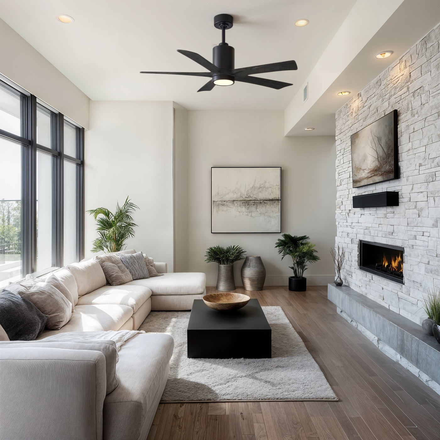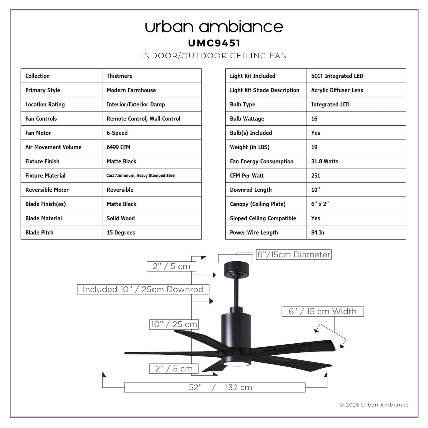 UMC9451 Modern Farmhouse Indoor/Outdoor Ceiling Fan, 14" (Plus Downrod) H x 52" W x 52" D, Matte Black Finish, Thistmere Collection