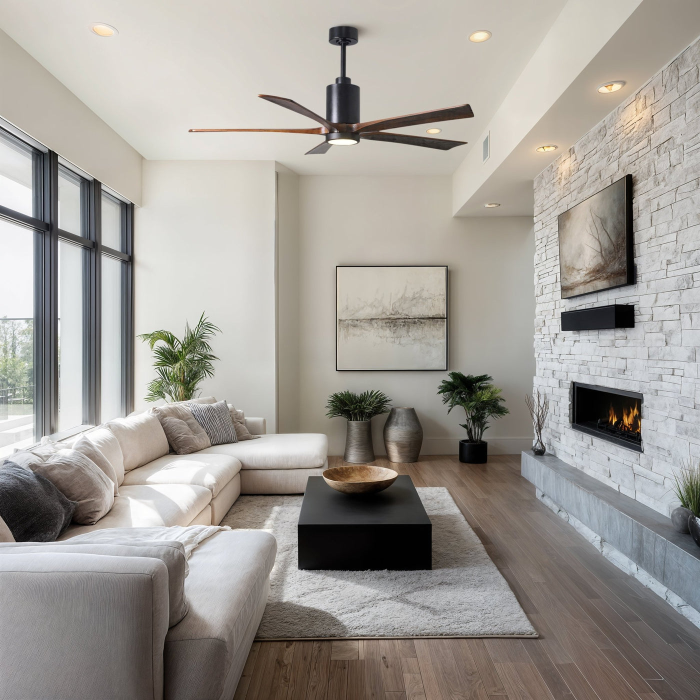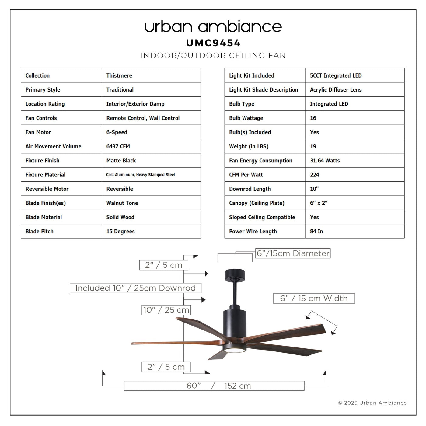 UMC9454 Traditional Indoor/Outdoor Ceiling Fan, 14" (Plus Downrod) H x 60" W x 60" D, Matte Black Finish, Thistmere Collection