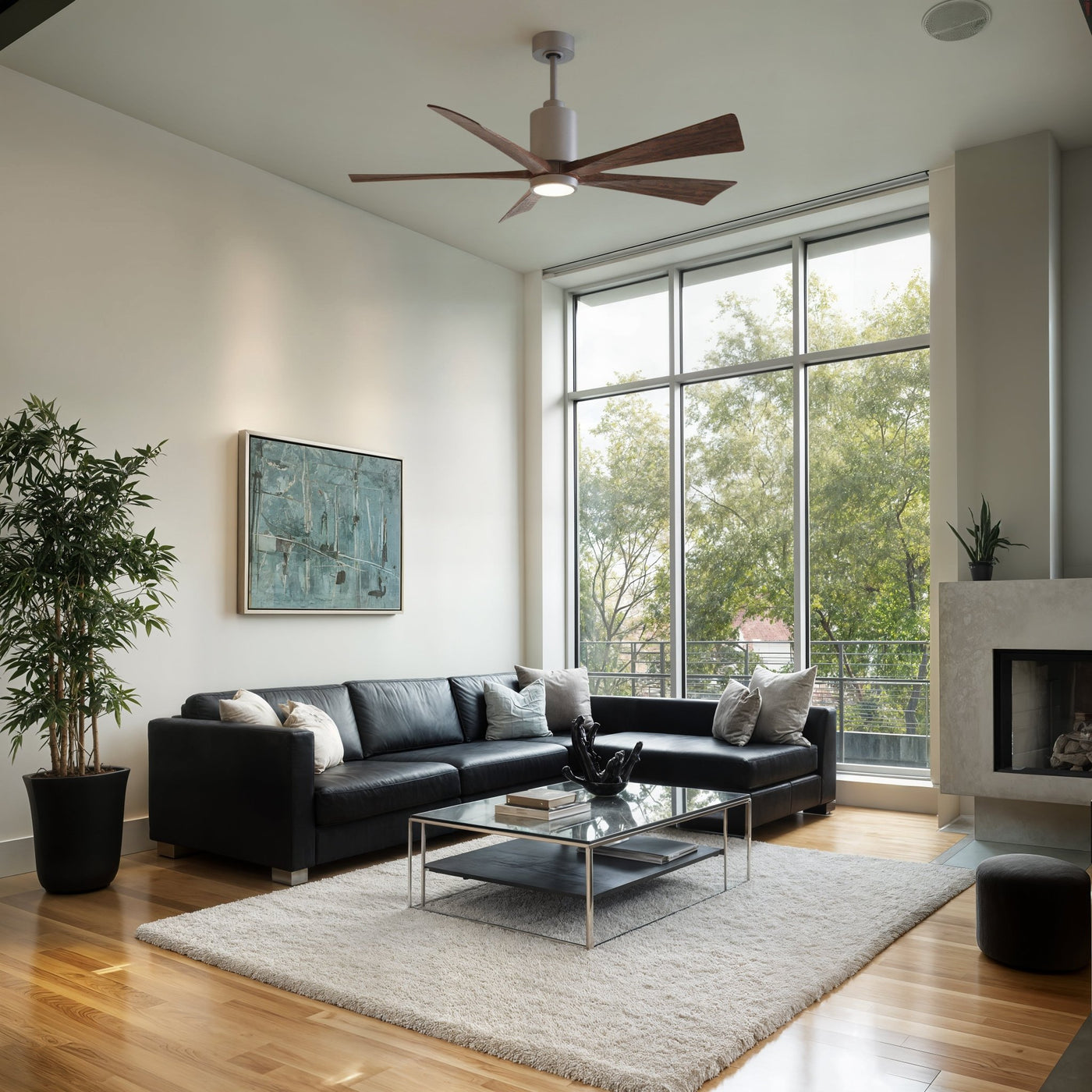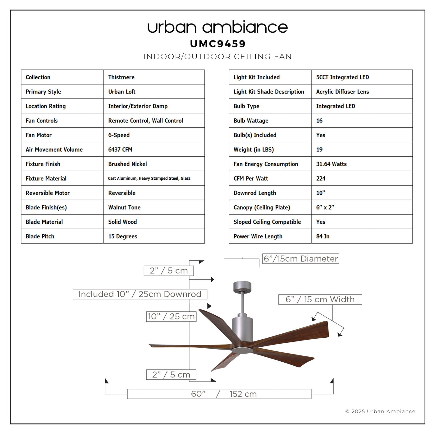 UMC9459 Urban Loft Indoor/Outdoor Ceiling Fan, 14" (Plus Downrod) H x 60" W x 60" D, Brushed Nickel Finish, Thistmere Collection