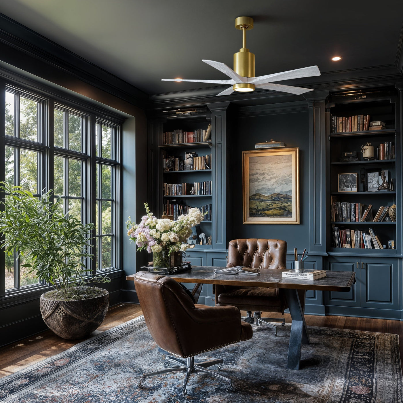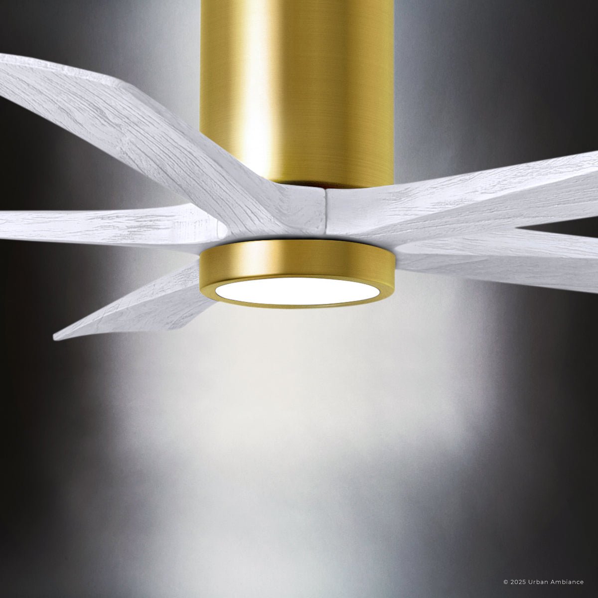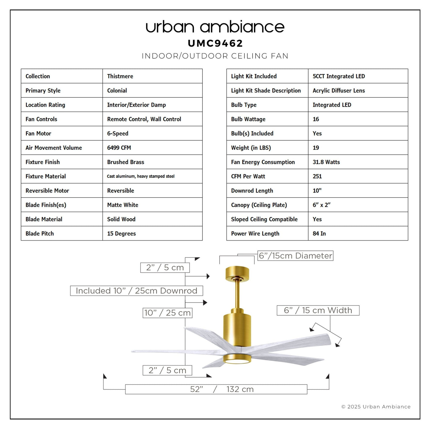 UMC9462 Colonial Indoor/Outdoor Ceiling Fan, 14" (Plus Downrod) H x 52" W x 52" D, Brushed Brass Finish, Thistmere Collection
