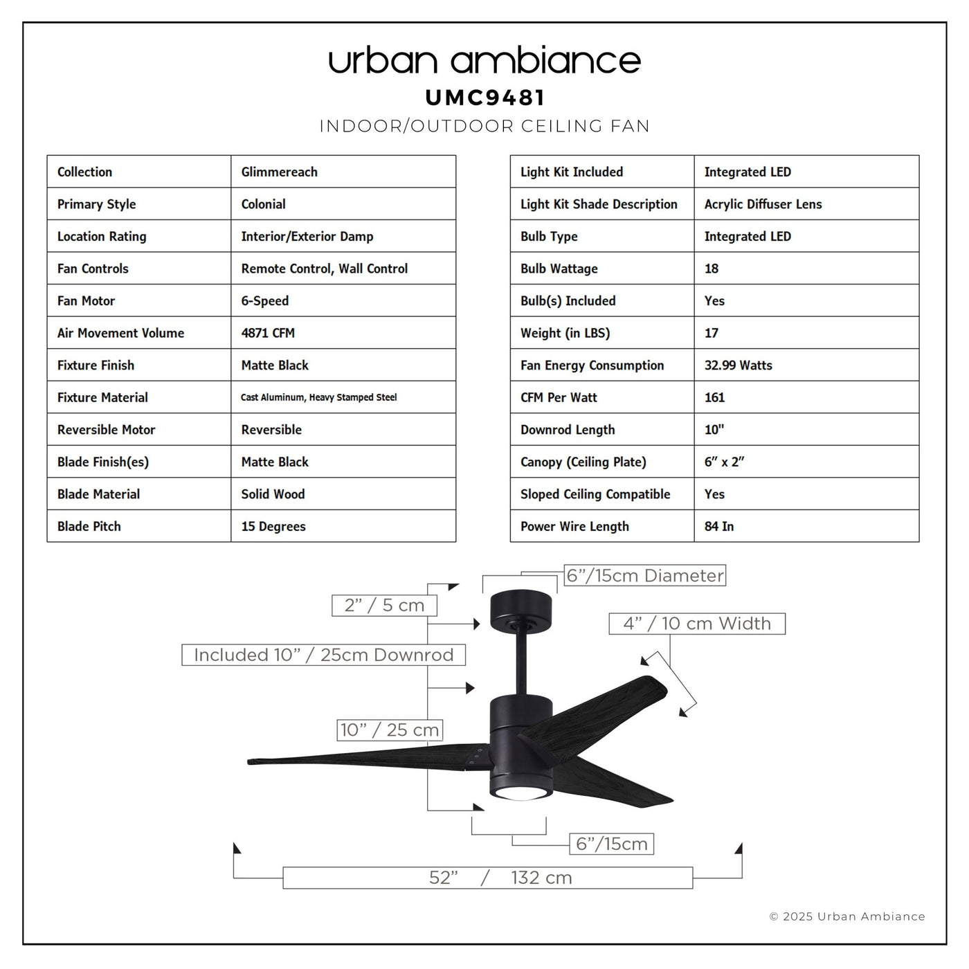 UMC9481 Colonial Indoor/Outdoor Ceiling Fan, 12" (Plus Downrod) H x 52" W x 52" D, Matte Black Finish, Glimmereach Collection