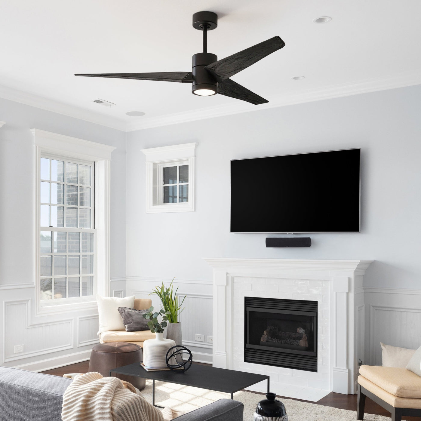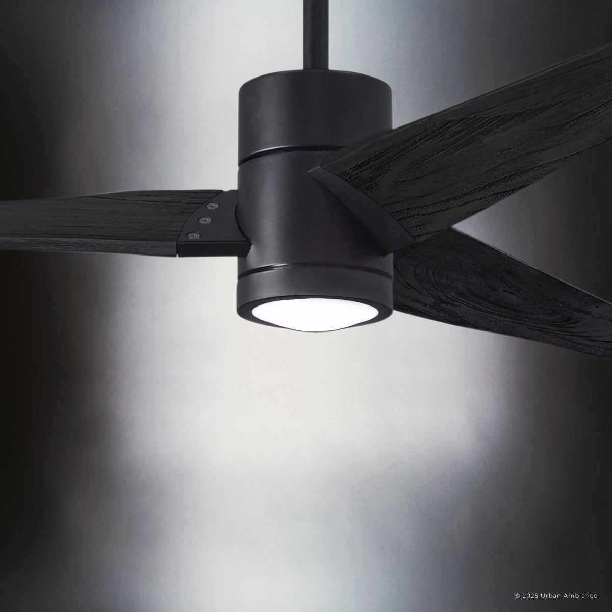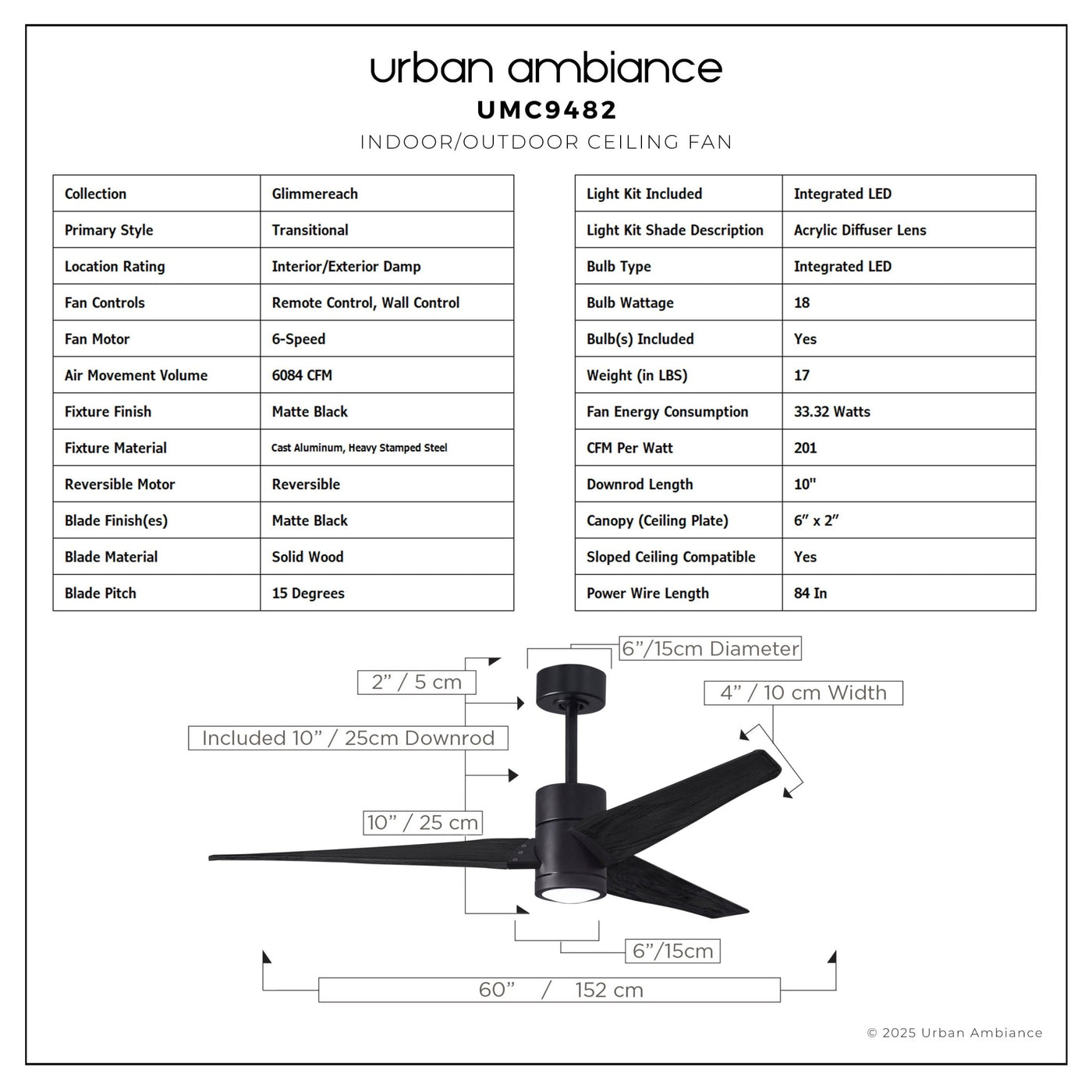 UMC9482 Transitional Indoor/Outdoor Ceiling Fan, 12" (Plus Downrod) H x 60" W x 60" D, Matte Black Finish, Glimmereach Collection