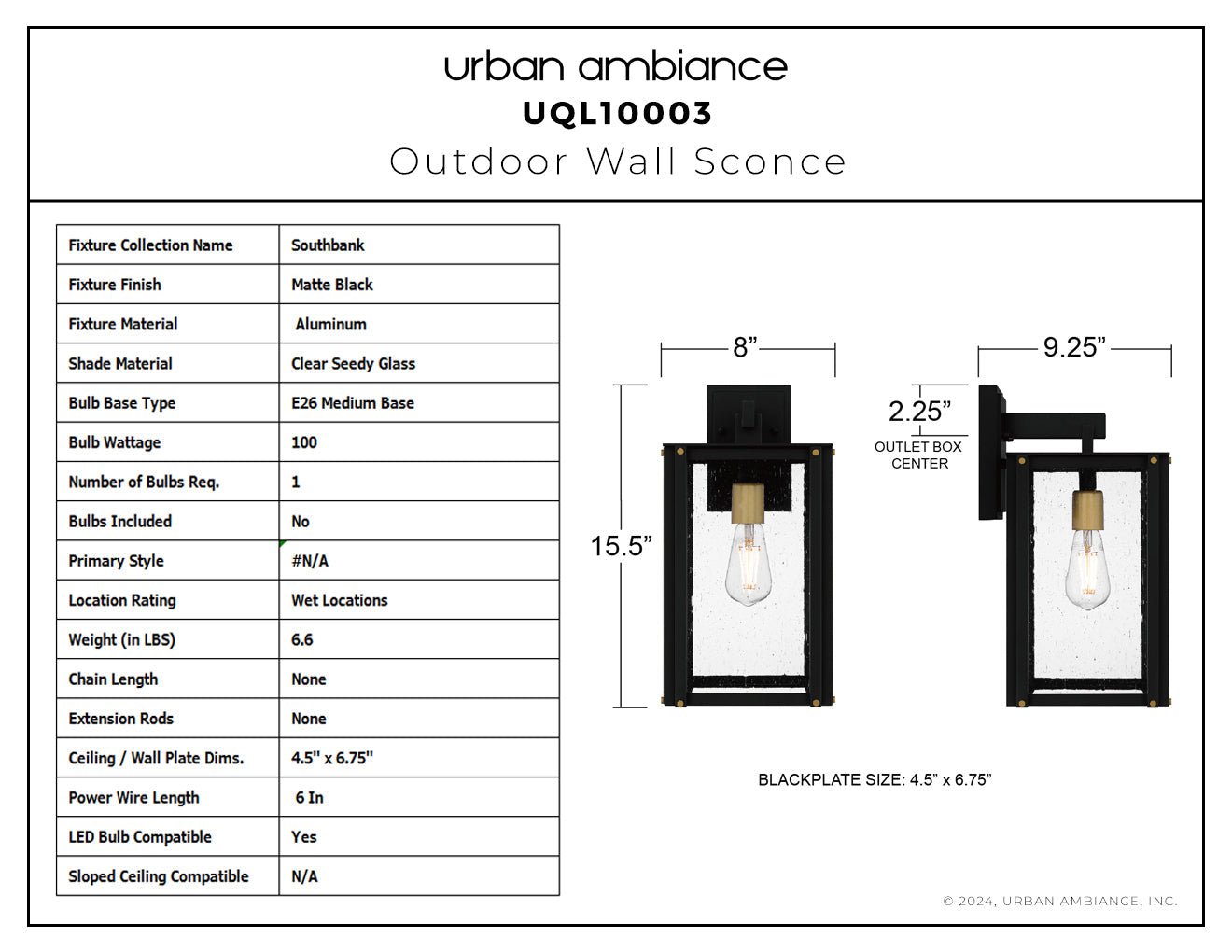 UQL10003 Mid Century Modern Outdoor Wall Sconce, 15.5''H x 8''W x 9.25''D, Matte Black Finish, Southbank Collection