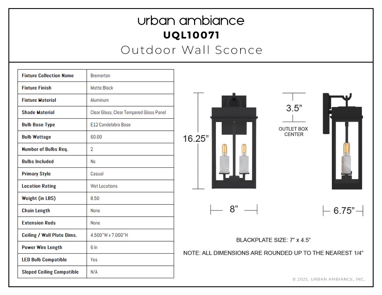 UQL10071 Casual Outdoor Wall Sconce, 16.25''H x 8.00''W x 6.75''Dep, Matte Black Finish, Bremerton Collection