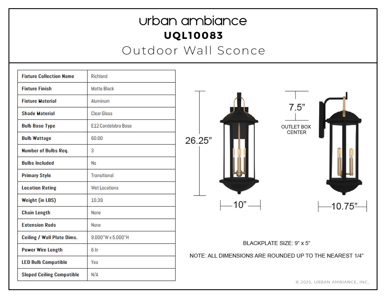 UQL10083 Transitional Outdoor Wall Sconce, 26.25''H x 10.00''W x 10.75''Dep, Matte Black Finish, Richland Collection
