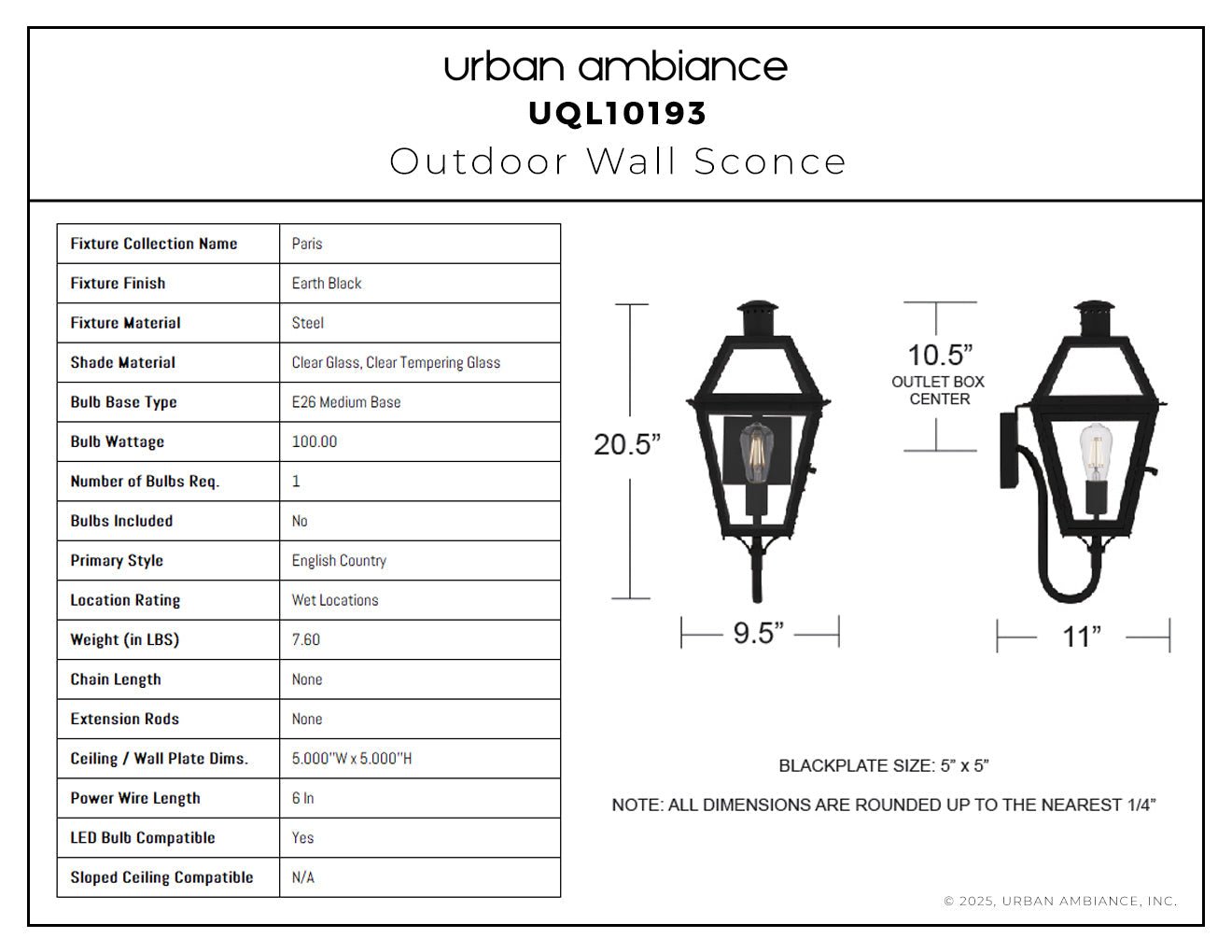 UQL10193 English Country Outdoor Wall Sconce, 20.50''H x 9.50''W x 11.00''Dep, Earth Black Finish, Paris Collection