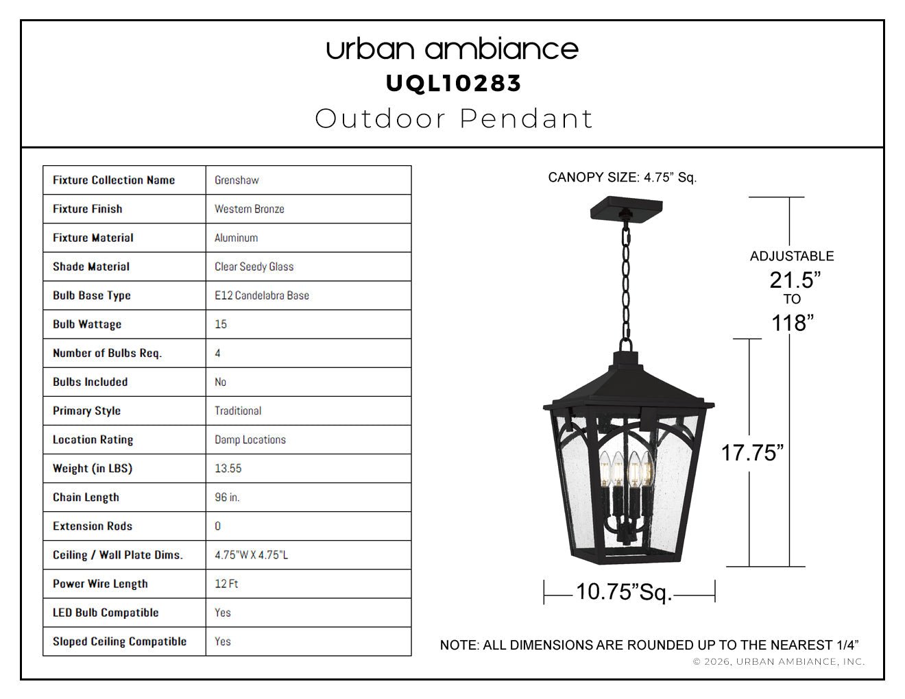 UQL10283 Traditional Outdoor Pendant, 17.75''H x 10.75''W x 10.75''Dep, Western Bronze Finish, Grenshaw Collection