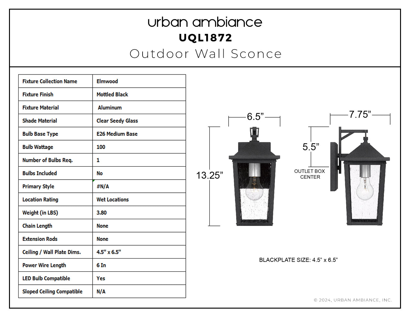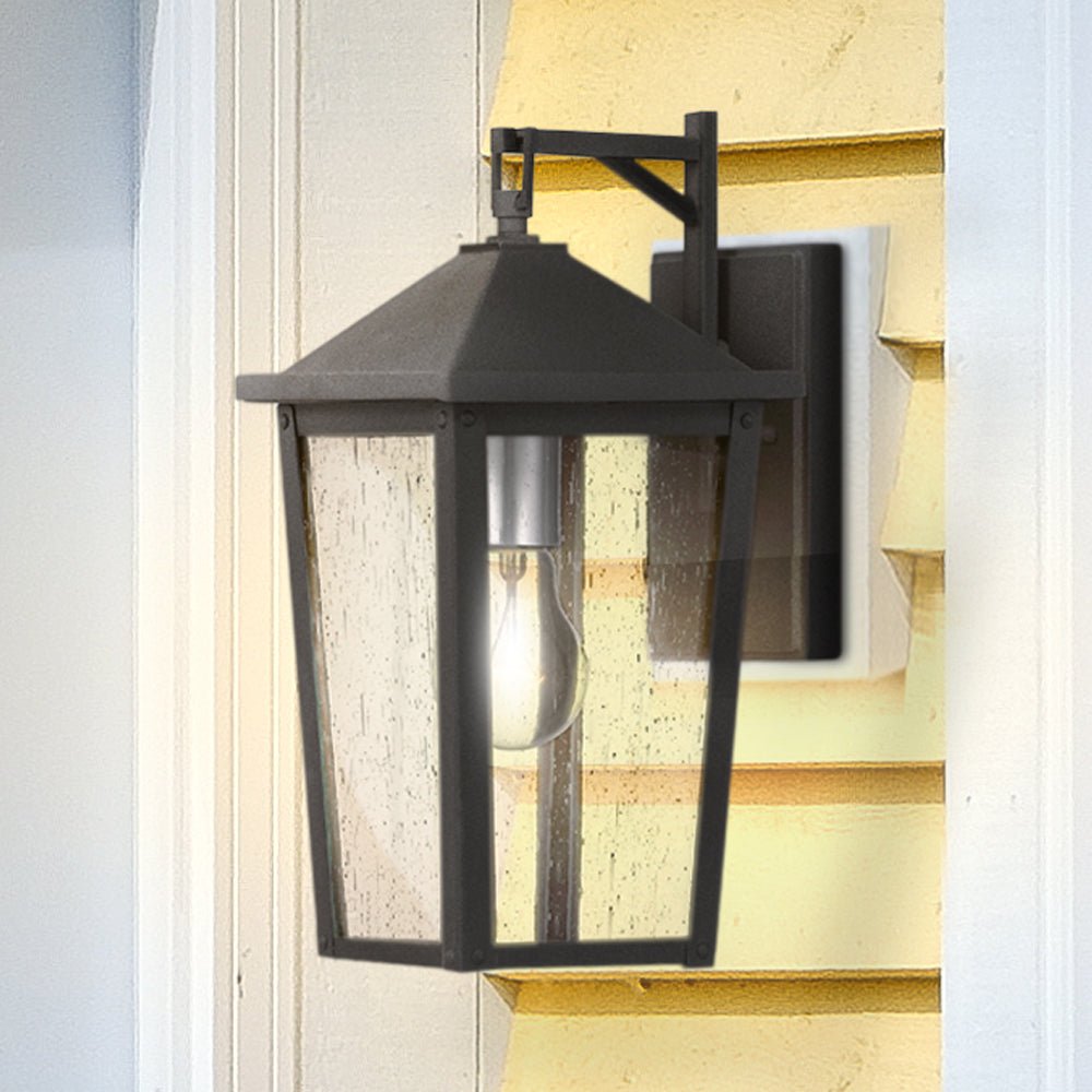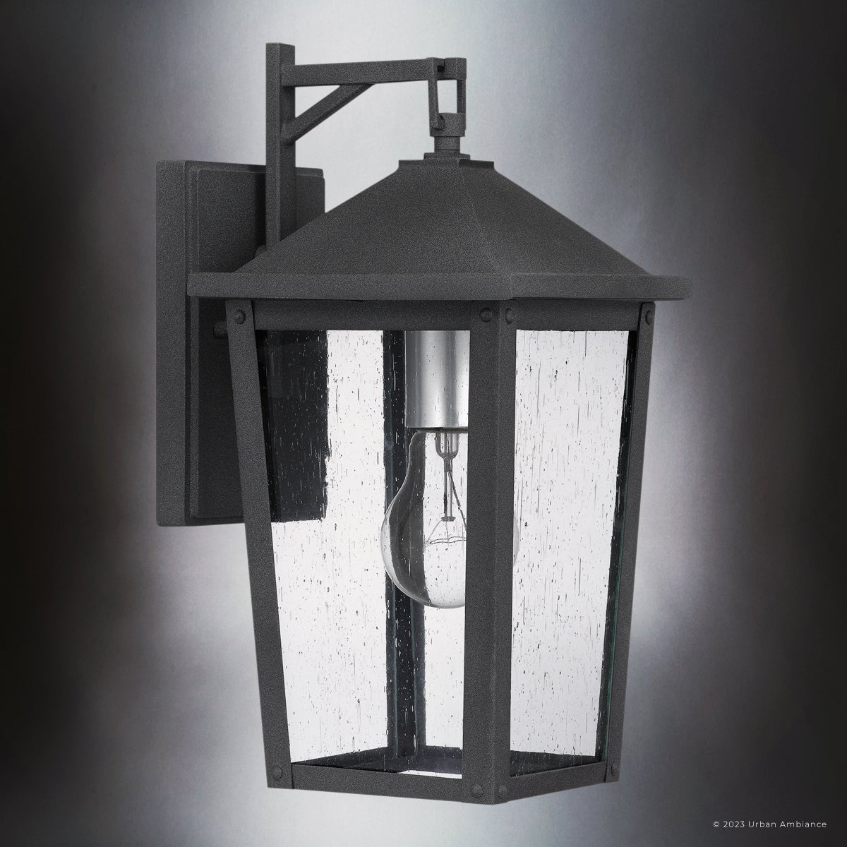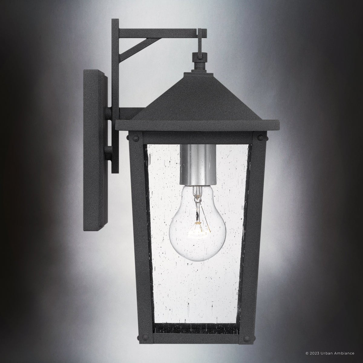 UQL1872 Modern Rustic Outdoor Wall Sconce, 13.25''H x 6.50''W x 7.75''D, Mottled Black Finish, Elmwood Collection