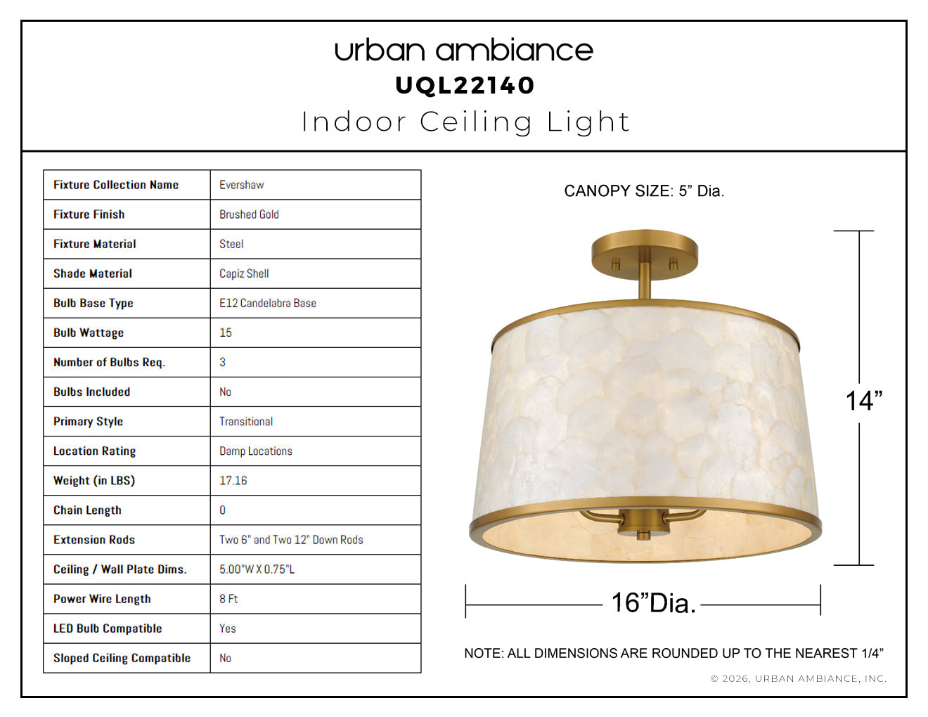 UQL22140 Transitional Indoor Ceiling Light, 14''H x 16''W x 16''Dep, Brushed Gold Finish, Evershaw Collection