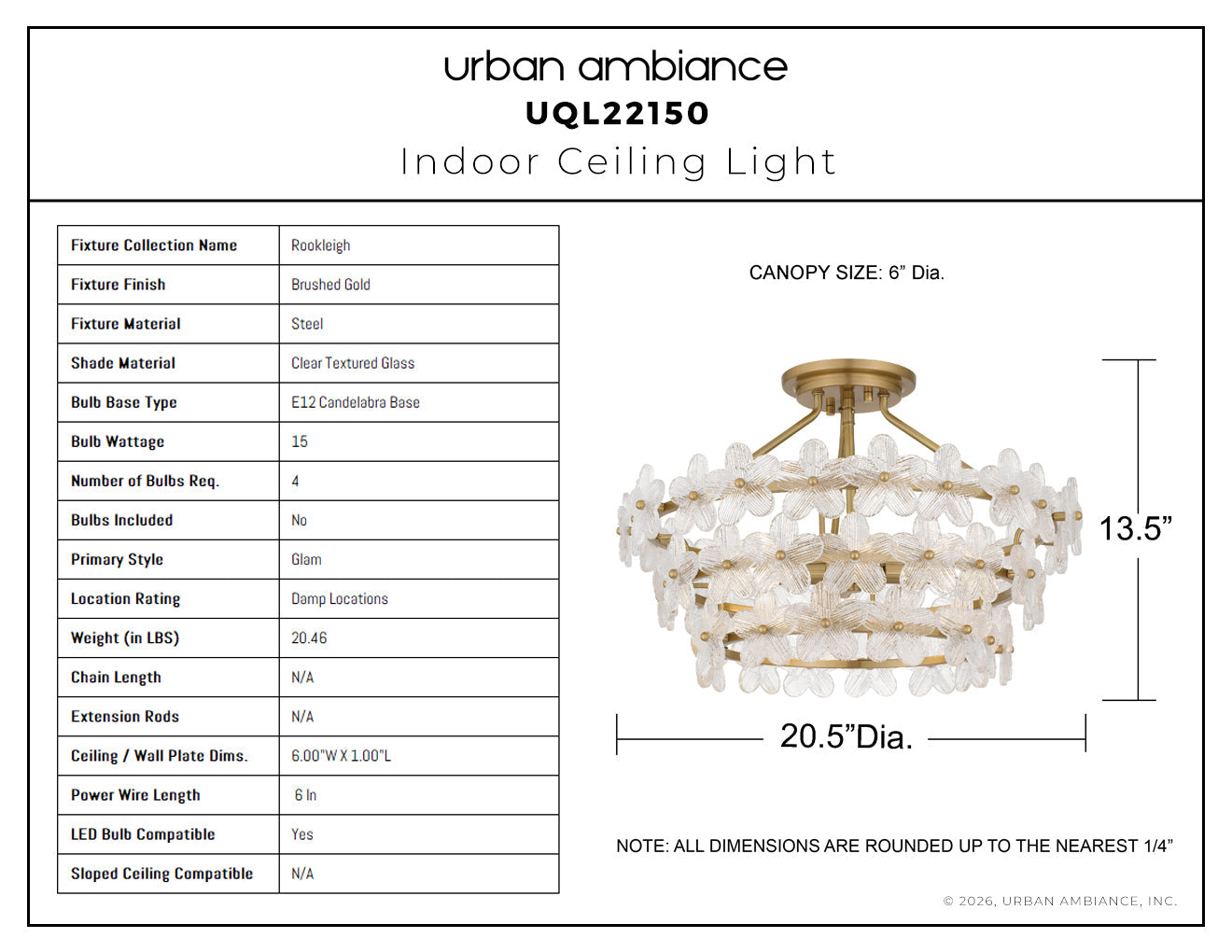 UQL22150 Glam Indoor Ceiling Light, 13.5''H x 20.5''W x 20.5''Dep, Brushed Gold Finish, Rookleigh Collection