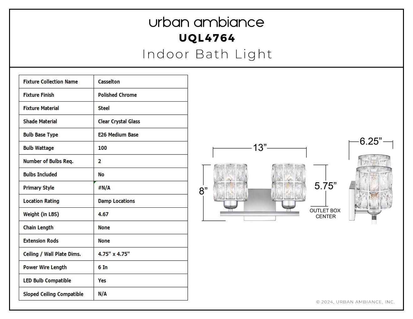UQL4764 Cosmopolitan Indoor Bath Light, 8.00''H x 13.00''W x 6.25''D, Polished Chrome Finish, Casselton Collection