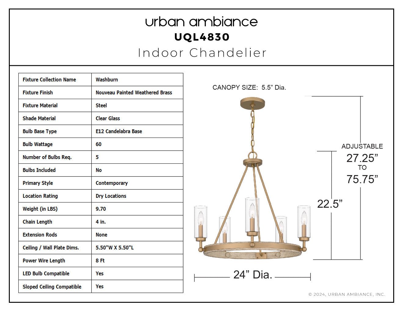 UQL4830 Contemporary Indoor Chandelier, 22.50''H x 24.00''W x 24.00''D, Nouveau Painted Weathered Brass Finish, Washburn Collection