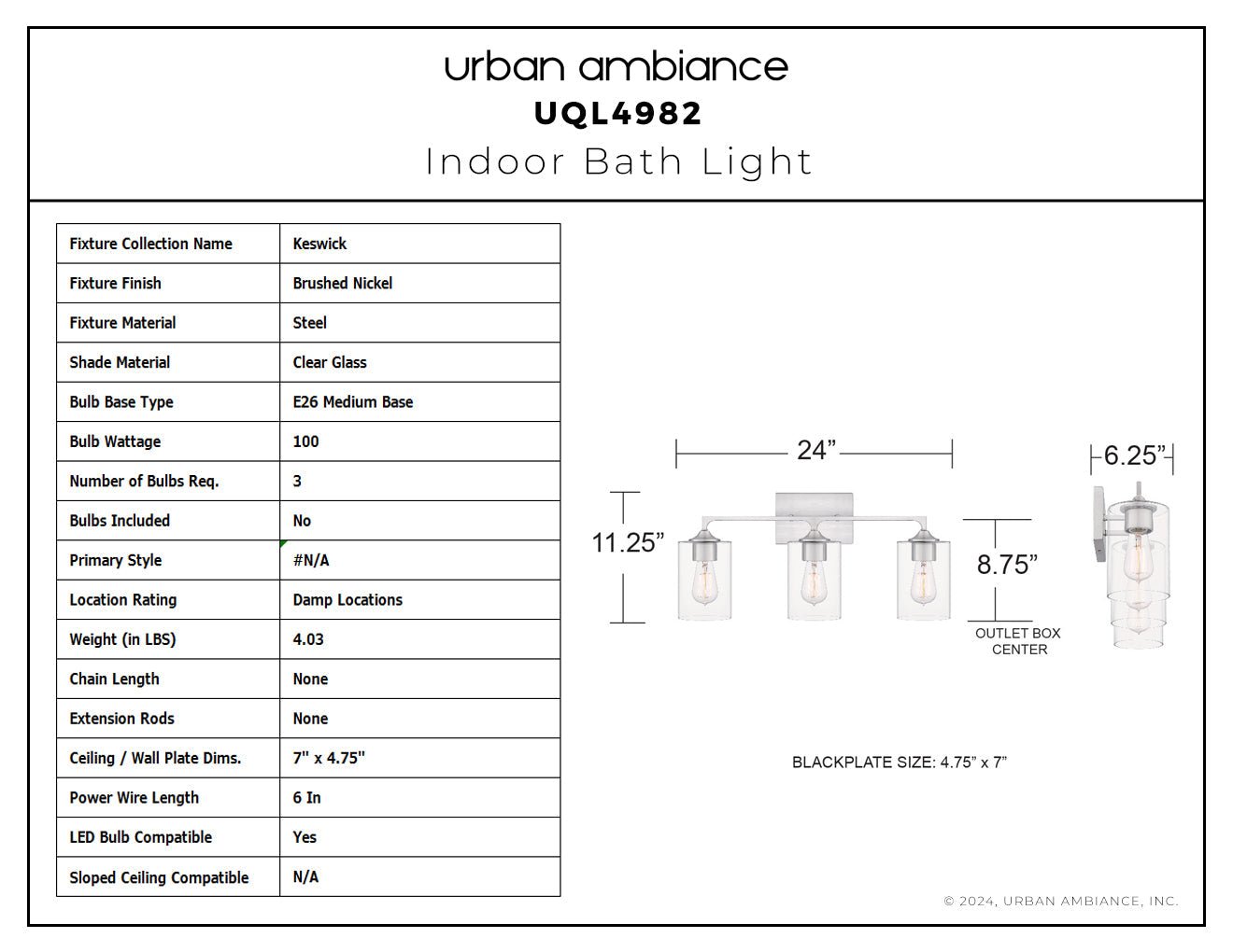 UQL4982 Transitional Indoor Bath Light, 11.25''H x 24.00''W x 6.25''D, Brushed Nickel Finish, Keswick Collection