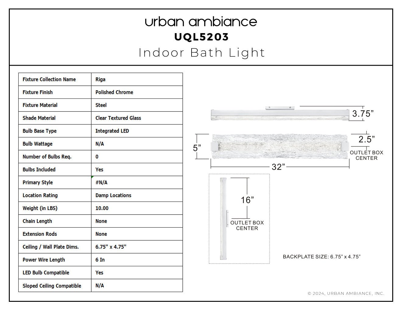 UQL5203 Contemporary Indoor Bath Light, 5.00''H x 32.00''W x 3.75''D, Polished Chrome Finish, Riga Collection