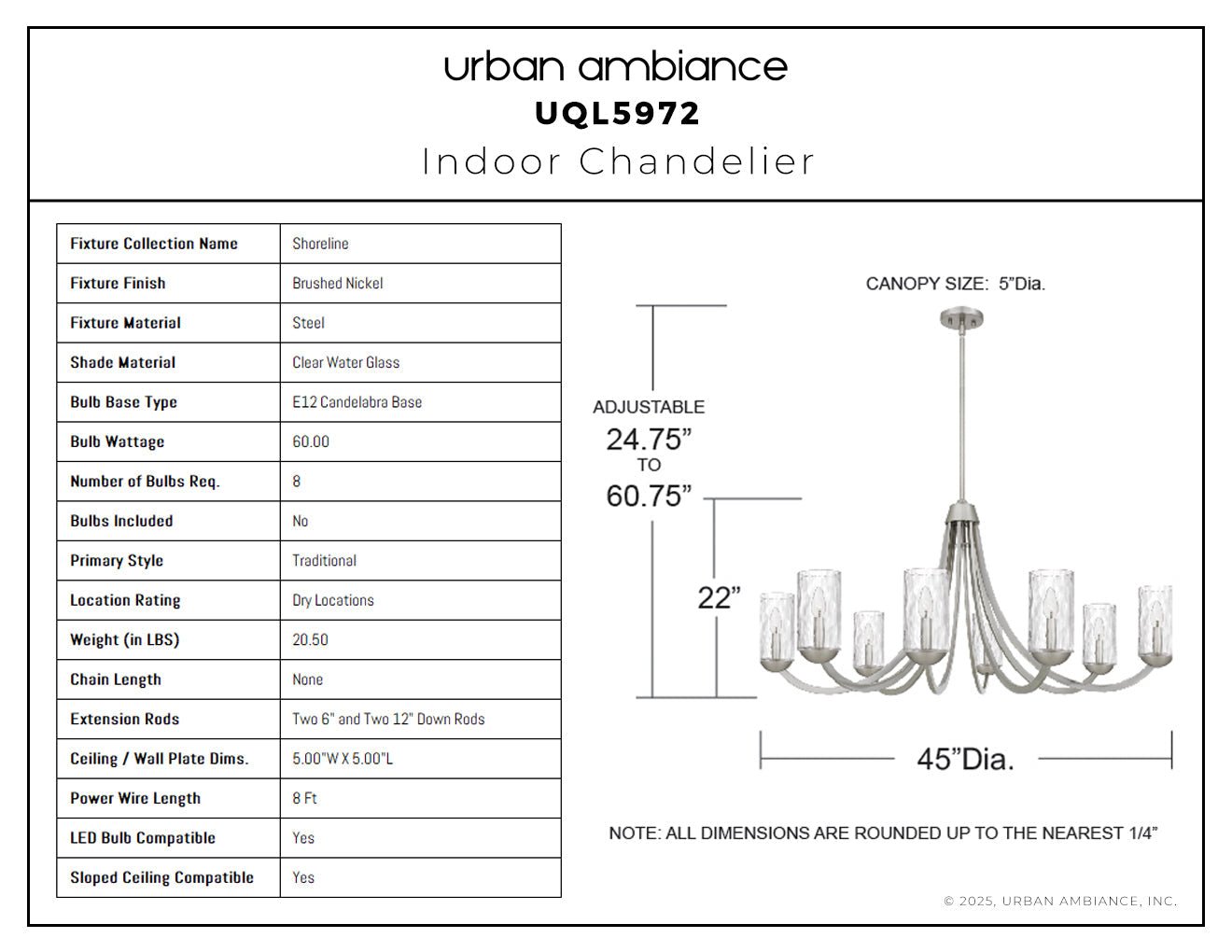 UQL5972 Traditional Indoor Chandelier, 22.00''H x 45.00''W x 45.00''Dep, Brushed Nickel Finish, Shoreline Collection