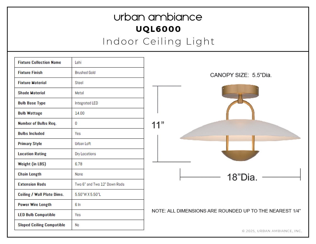 UQL6000 Urban Loft Indoor Ceiling Light, 11.00''H x 18.00''W x 18.00''Dep, Brushed Gold Finish, Lehi Collection