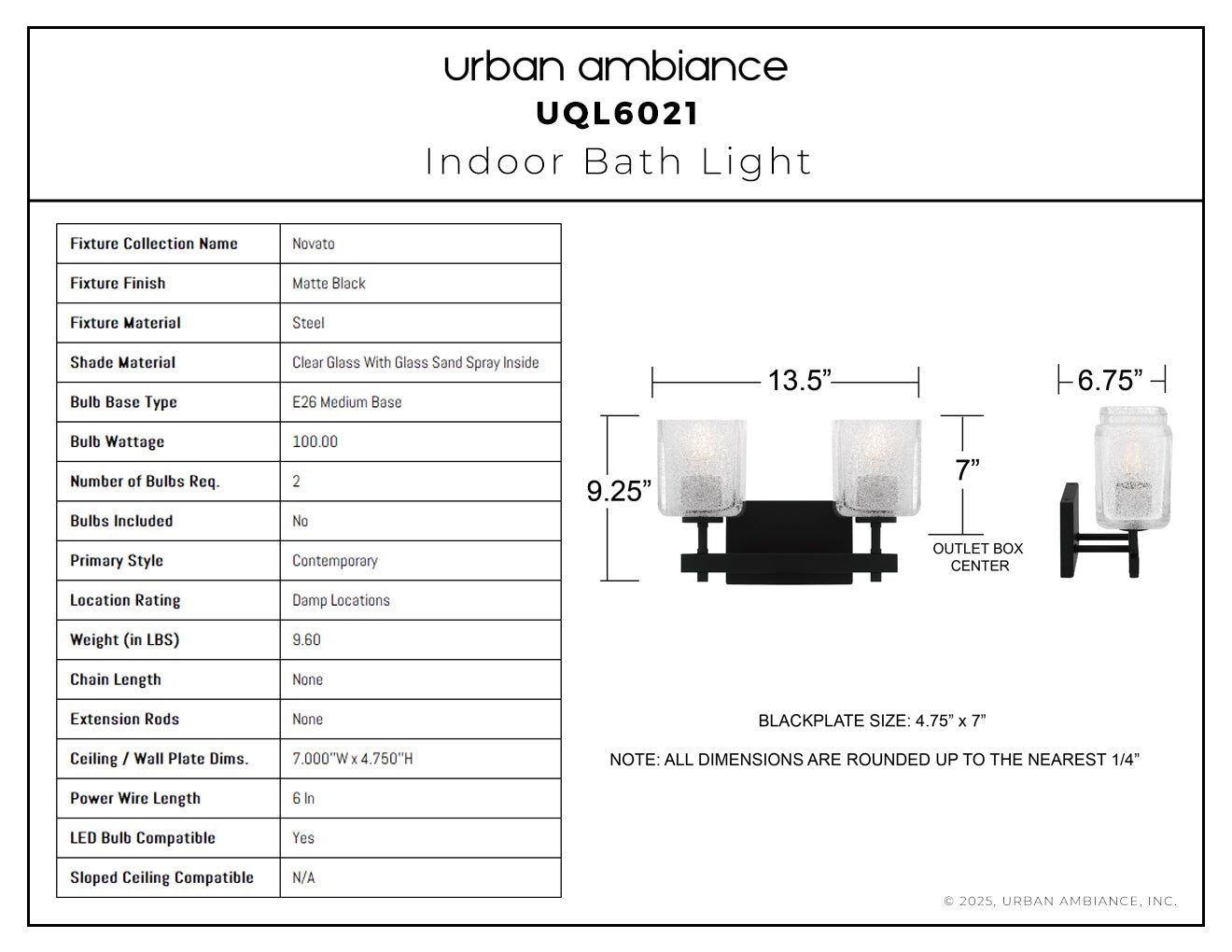 UQL6021 Contemporary Indoor Bath Light, 9.25''H x 13.50''W x 6.75''Dep, Matte Black Finish, Novato Collection
