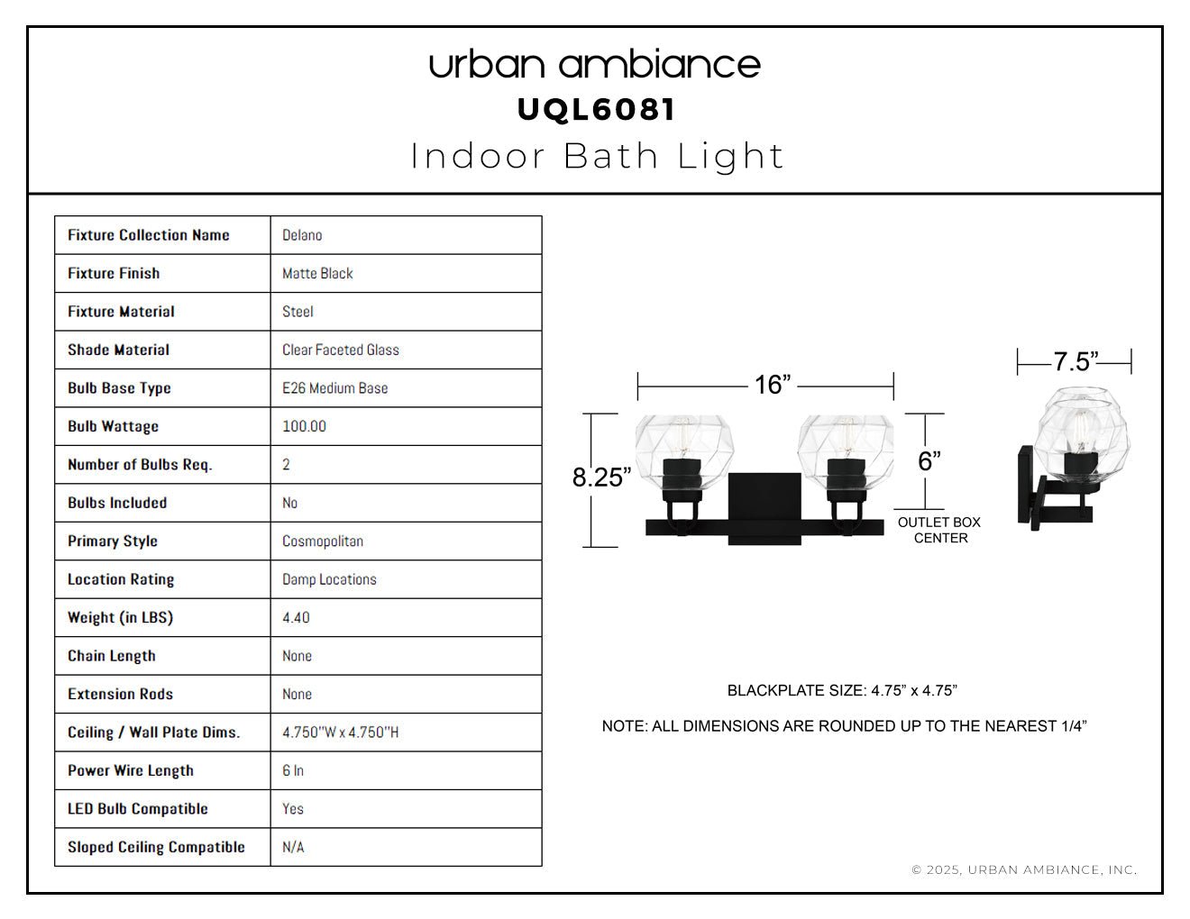 UQL6081 Cosmopolitan Indoor Bath Light, 8.25''H x 16.00''W x 7.50''Dep, Matte Black Finish, Delano Collection
