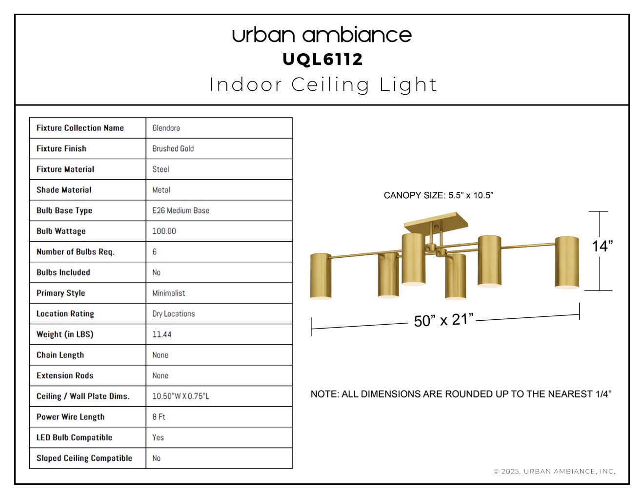 UQL6112 Minimalist Indoor Ceiling Light, 14.00''H x 50.00''W x 21.00''Dep, Brushed Gold Finish, Glendora Collection