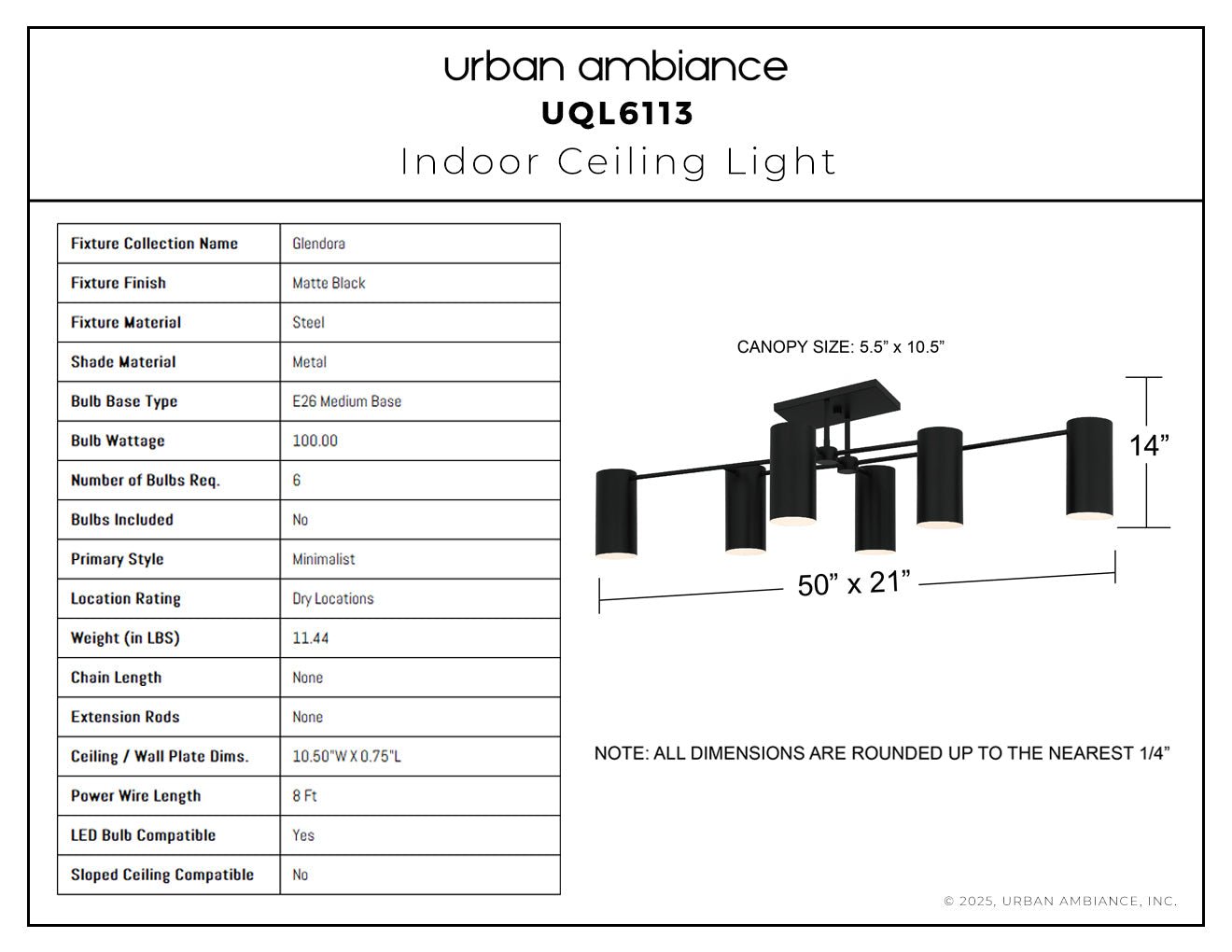 UQL6113 Minimalist Indoor Ceiling Light, 14.00''H x 50.00''W x 21.00''Dep, Matte Black Finish, Glendora Collection