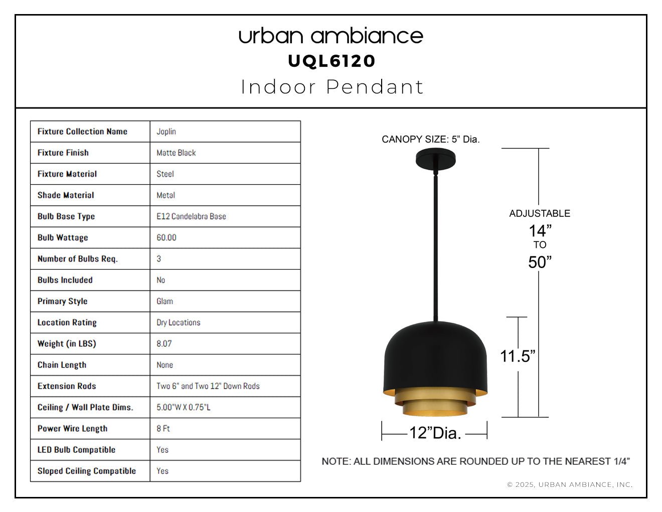 UQL6120 Glam Indoor Pendant, 11.50''H x 12.00''W x 12.00''Dep, Matte Black Finish, Joplin Collection