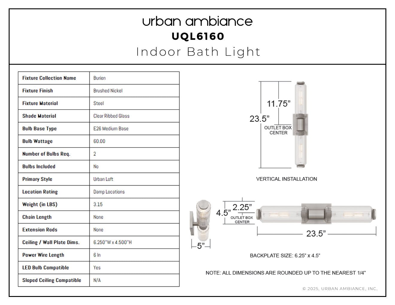 UQL6160 Urban Loft Indoor Bath Light, 4.50''H x 23.50''W x 5.00''Dep, Brushed Nickel Finish, Burien Collection