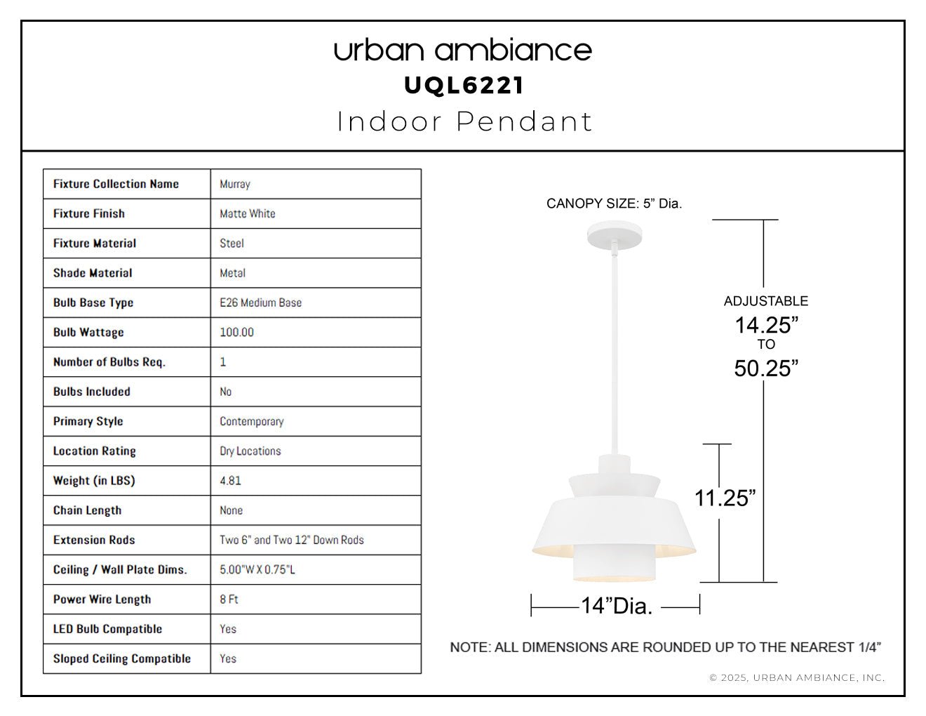 UQL6221 Contemporary Indoor Pendant, 11.25''H x 14.00''W x 14.00''Dep, Matte White Finish, Murray Collection