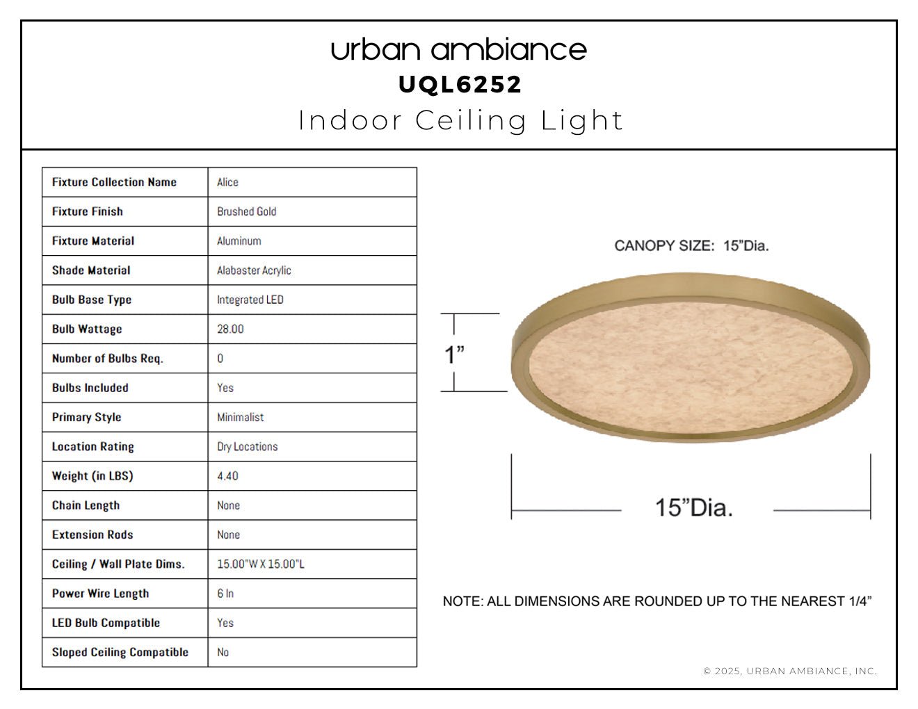 UQL6252 Minimalist Indoor Ceiling Light, 1.00''H x 15.00''W x 15.00''Dep, Brushed Gold Finish, Alice Collection