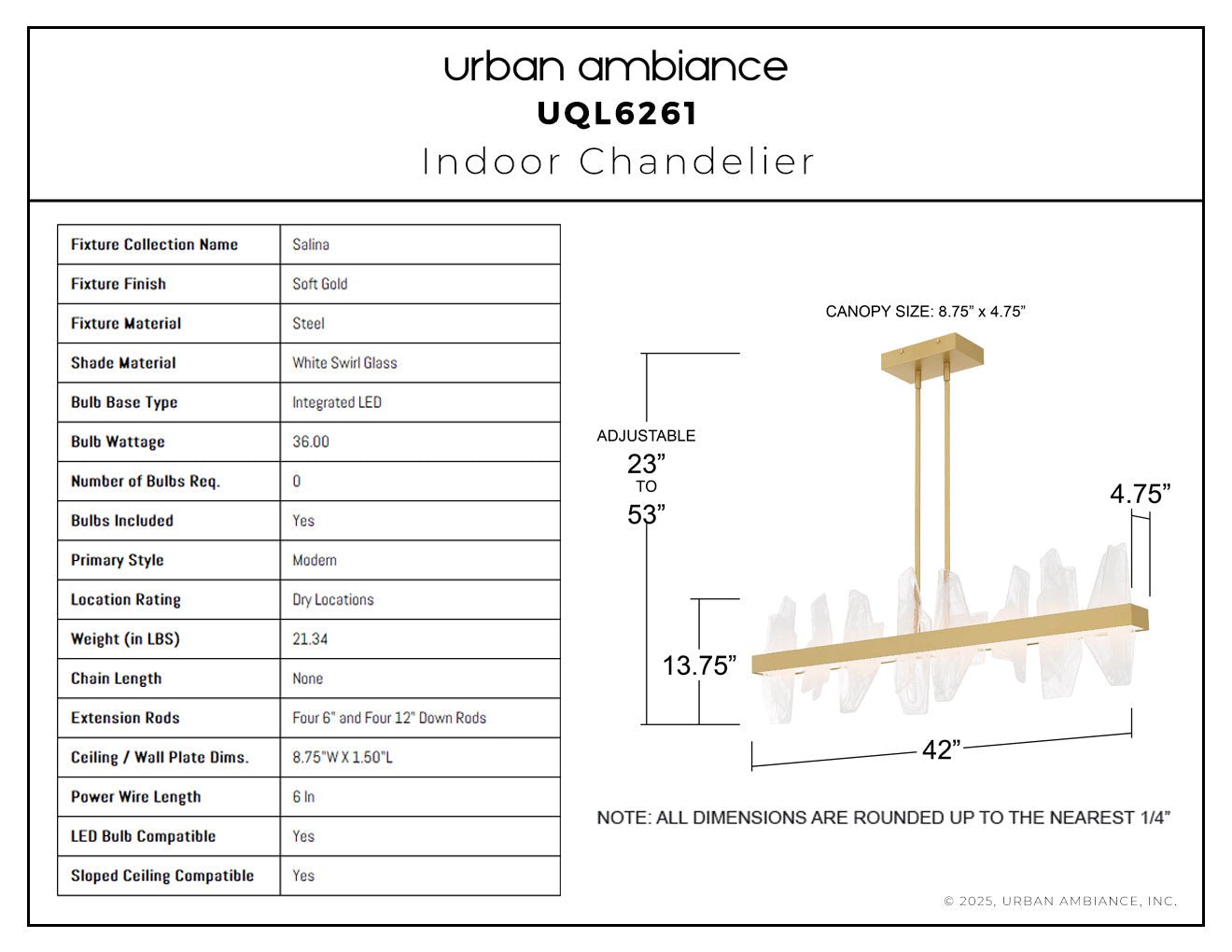 UQL6261 Modern Indoor Chandelier, 13.75''H x 42.00''W x 4.75''Dep, Soft Gold Finish, Salina Collection