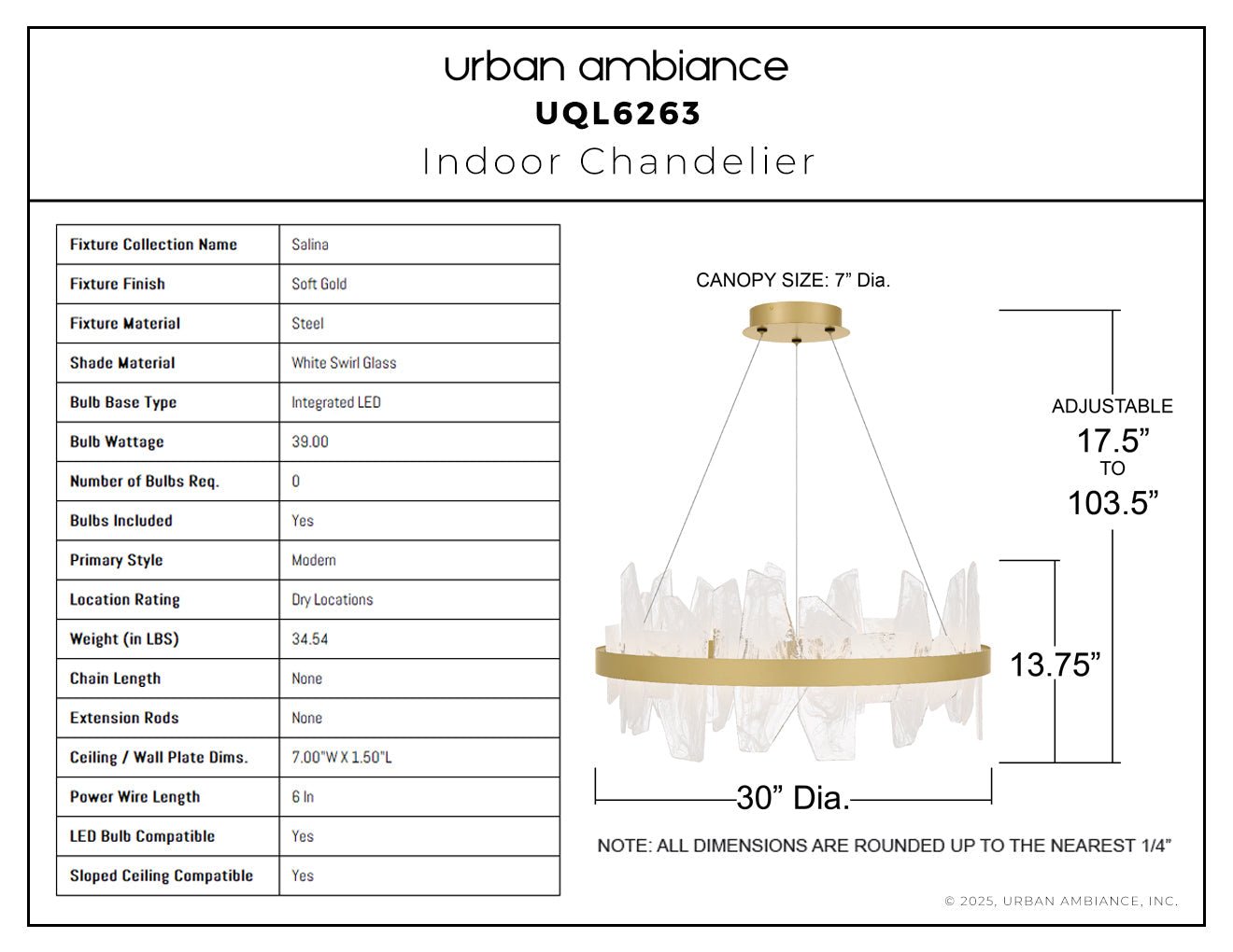 UQL6263 Modern Indoor Chandelier, 13.75''H x 30.00''W x 30.00''Dep, Soft Gold Finish, Salina Collection