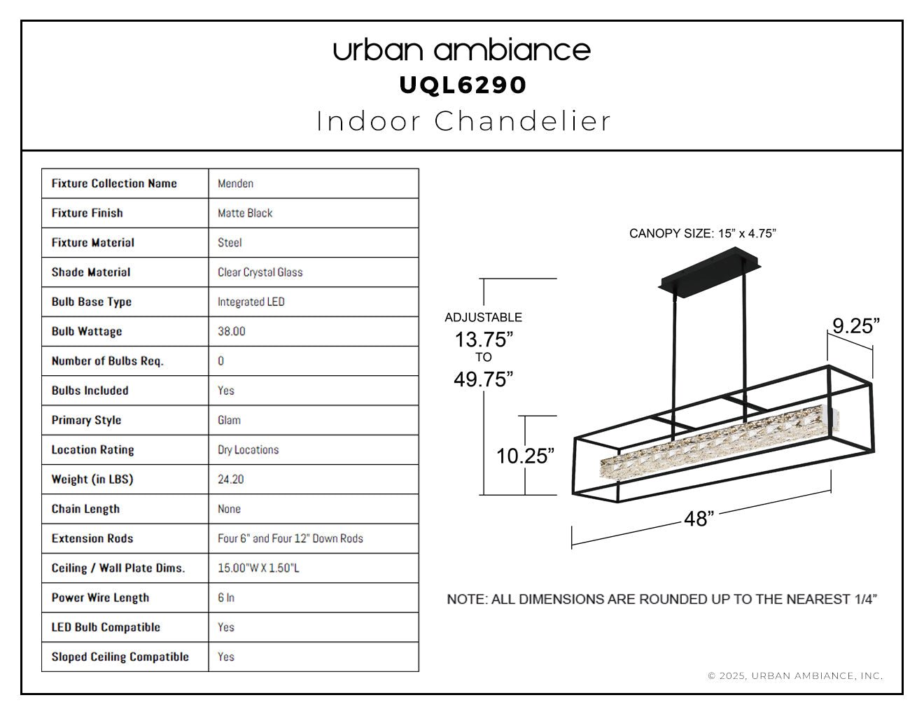 UQL6290 Glam Indoor Chandelier, 10.25''H x 48.00''W x 9.25''Dep, Matte Black Finish, Menden Collection