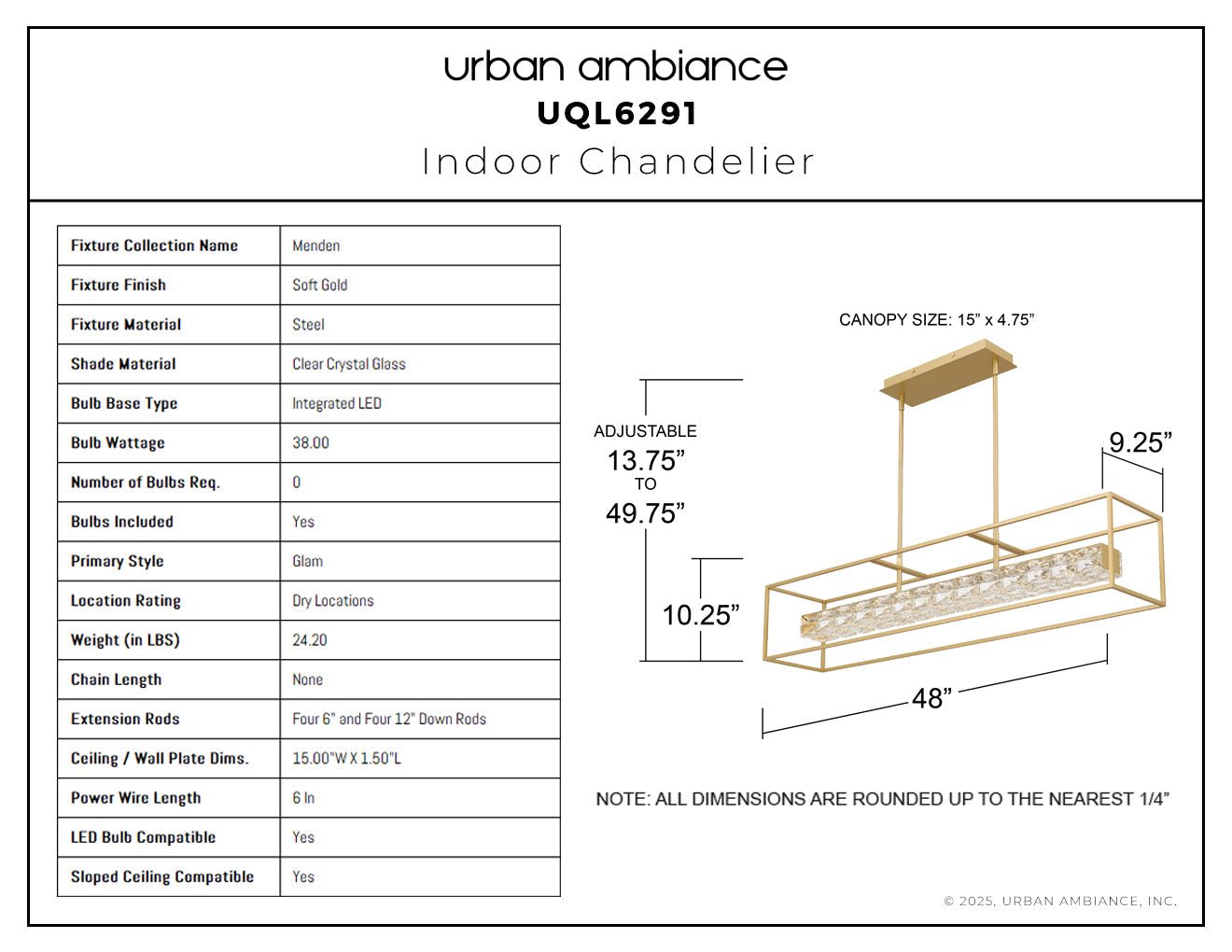 UQL6291 Glam Indoor Chandelier, 10.25''H x 48.00''W x 9.25''Dep, Soft Gold Finish, Menden Collection
