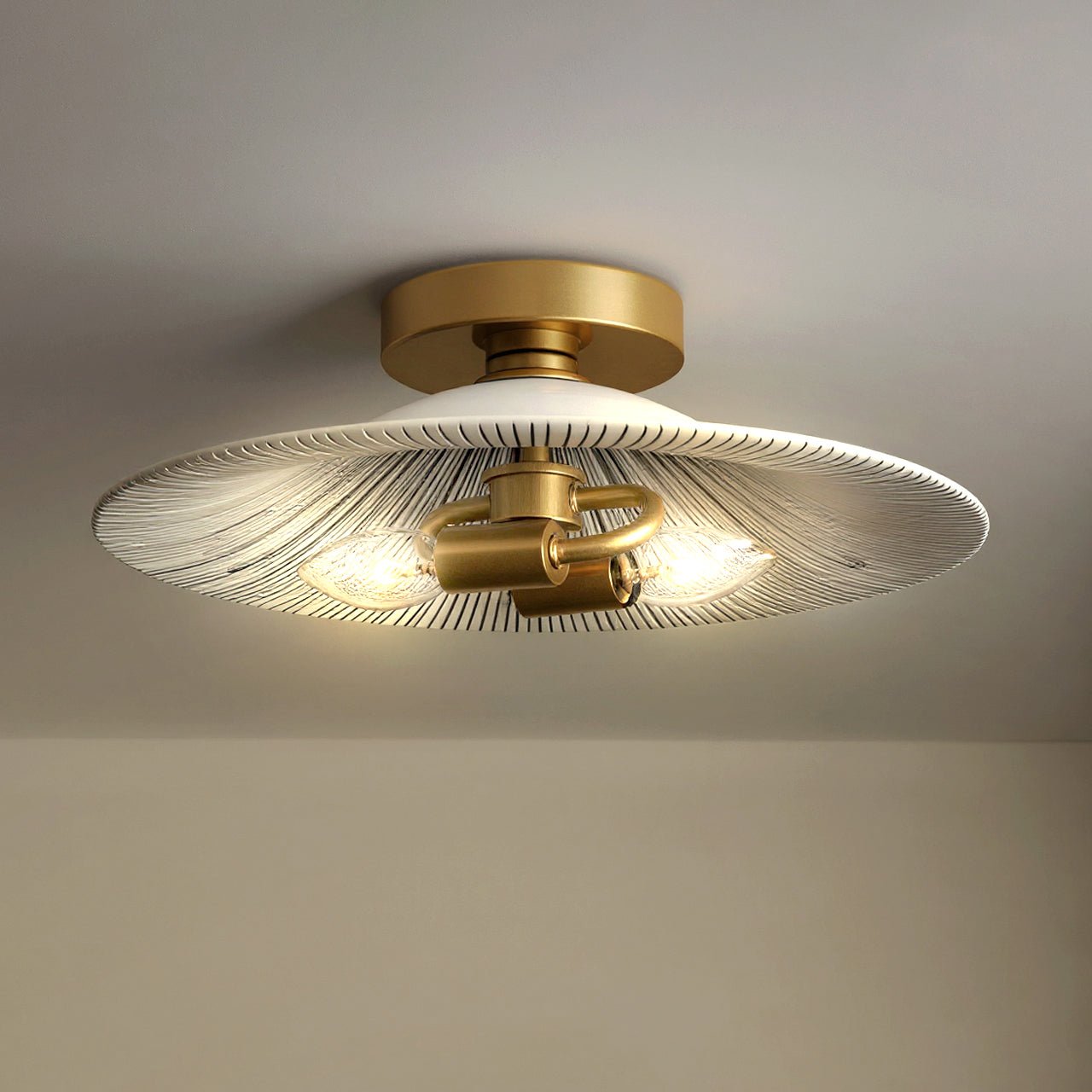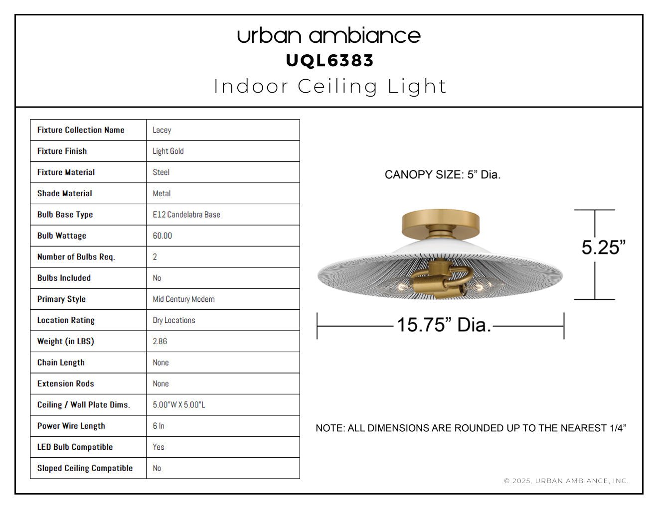 UQL6383 Mid Century Modern Indoor Ceiling Light, 5.25''H x 15.75''W x 15.75''Dep, Light Gold Finish, Lacey Collection
