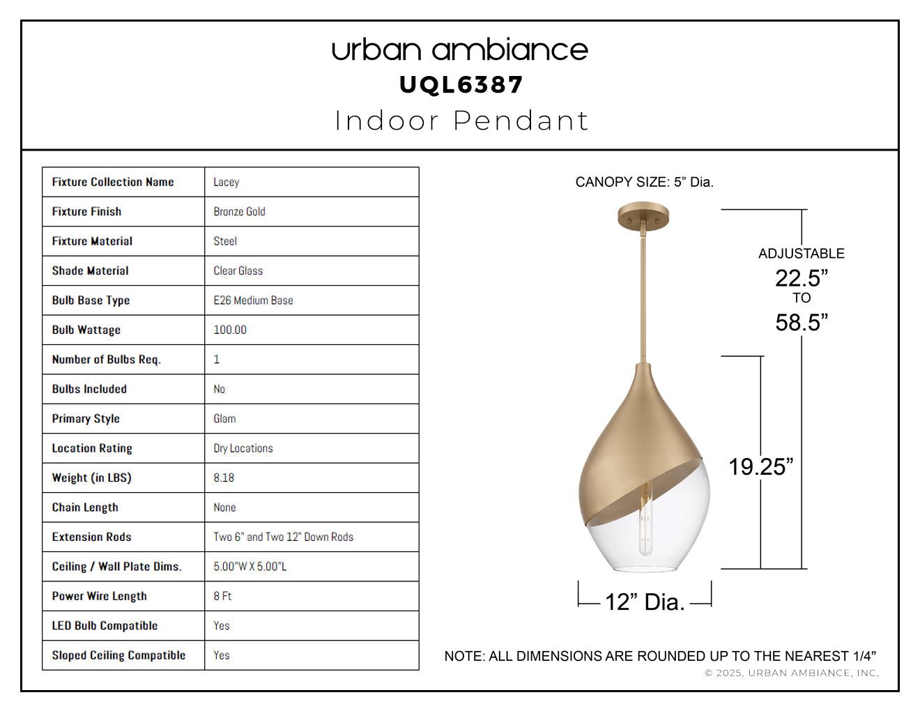 UQL6387 Glam Indoor Pendant, 20.25''H x 12.00''W x 12.00''Dep, Bronze Gold Finish, Lacey Collection