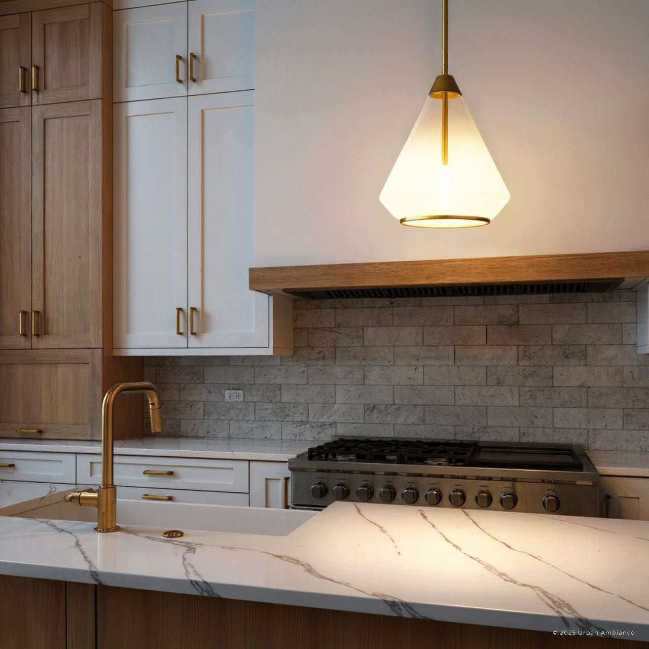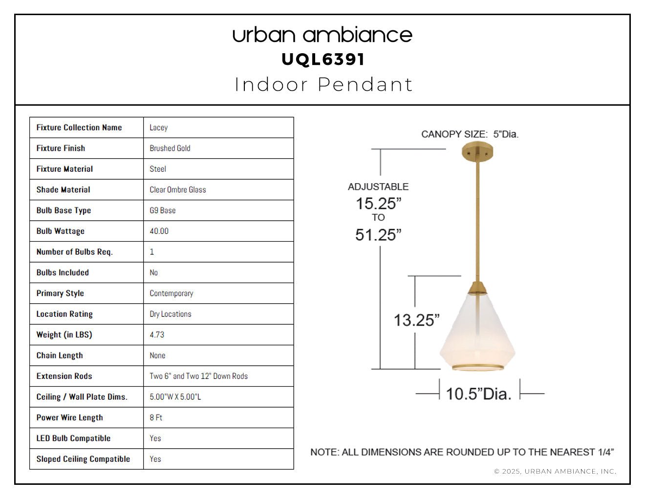 UQL6391 Contemporary Indoor Pendant, 13.25''H x 10.50''W x 10.50''Dep, Brushed Gold Finish, Lacey Collection