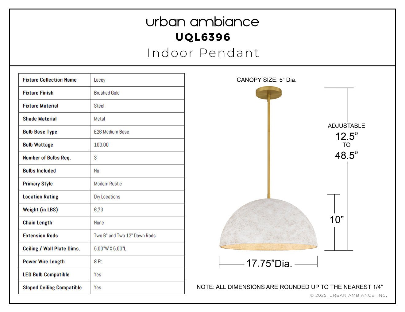 UQL6396 Modern Rustic Indoor Pendant, 10.00''H x 17.75''W x 17.75''Dep, Brushed Gold Finish, Lacey Collection