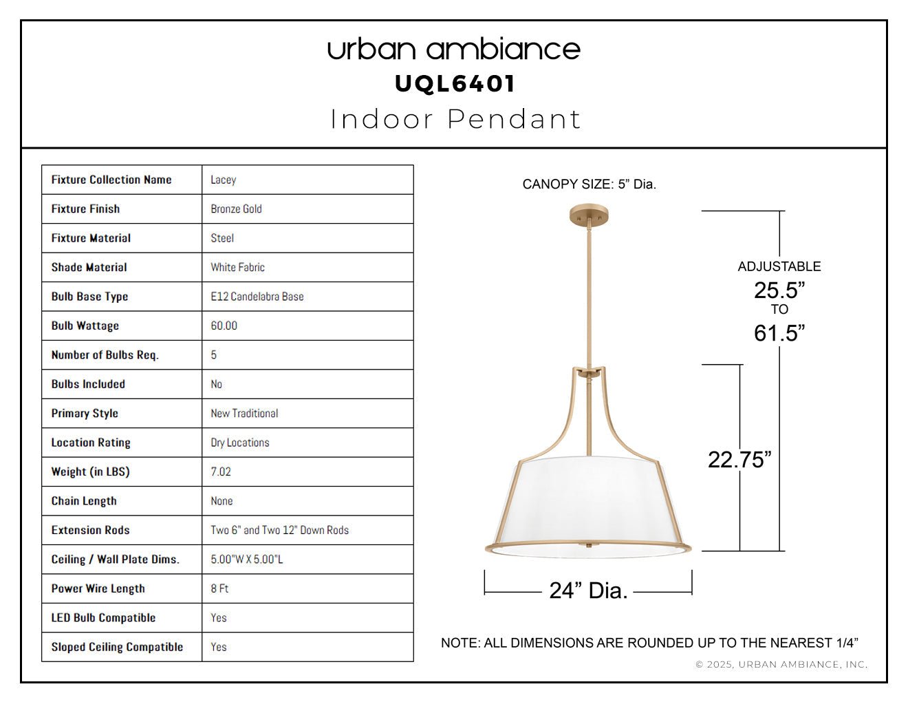 UQL6401 New Traditional Indoor Pendant, 22.75''H x 24.00''W x 24.00''Dep, Bronze Gold Finish, Lacey Collection
