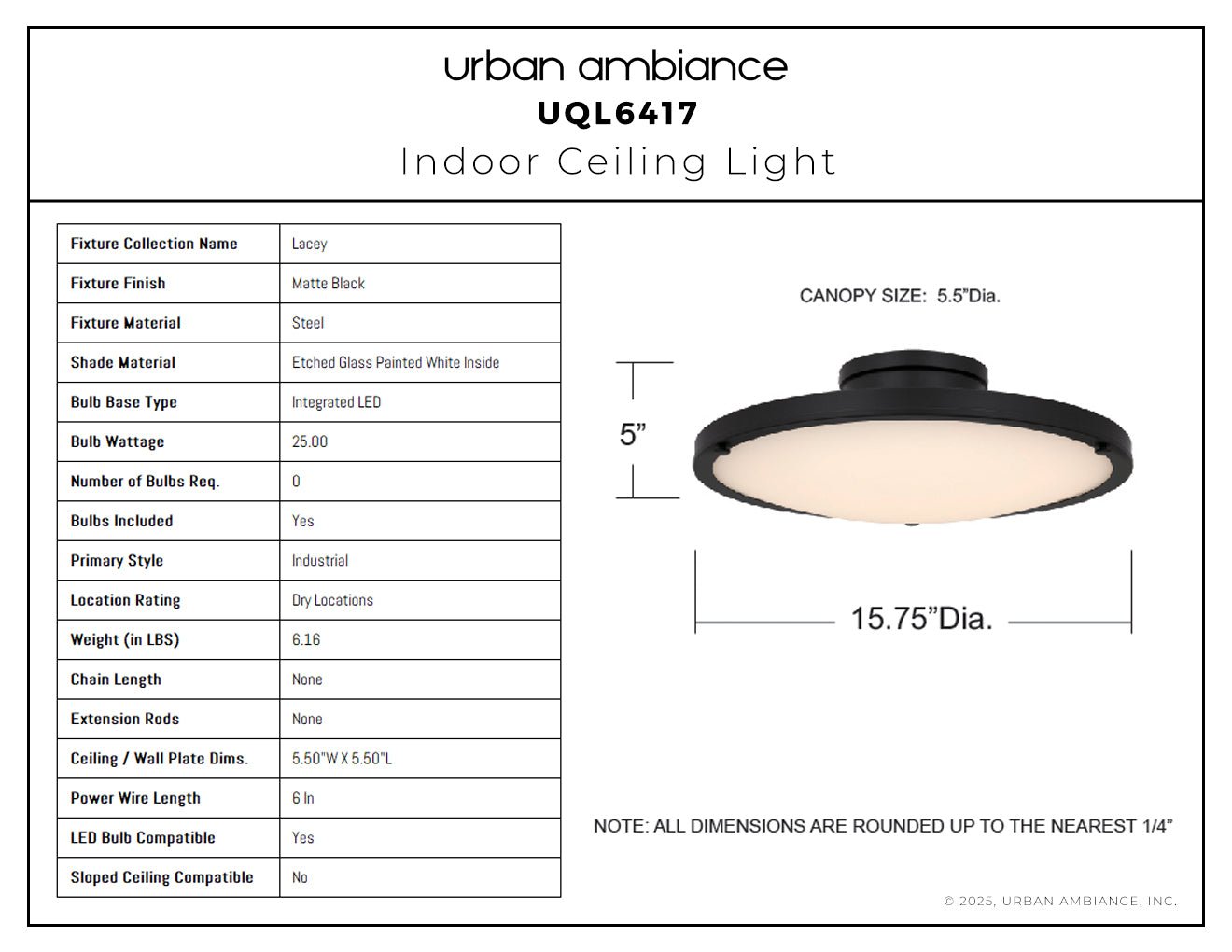 UQL6417 Industrial Indoor Ceiling Light, 5.00''H x 15.75''W x 15.75''Dep, Matte Black Finish, Lacey Collection