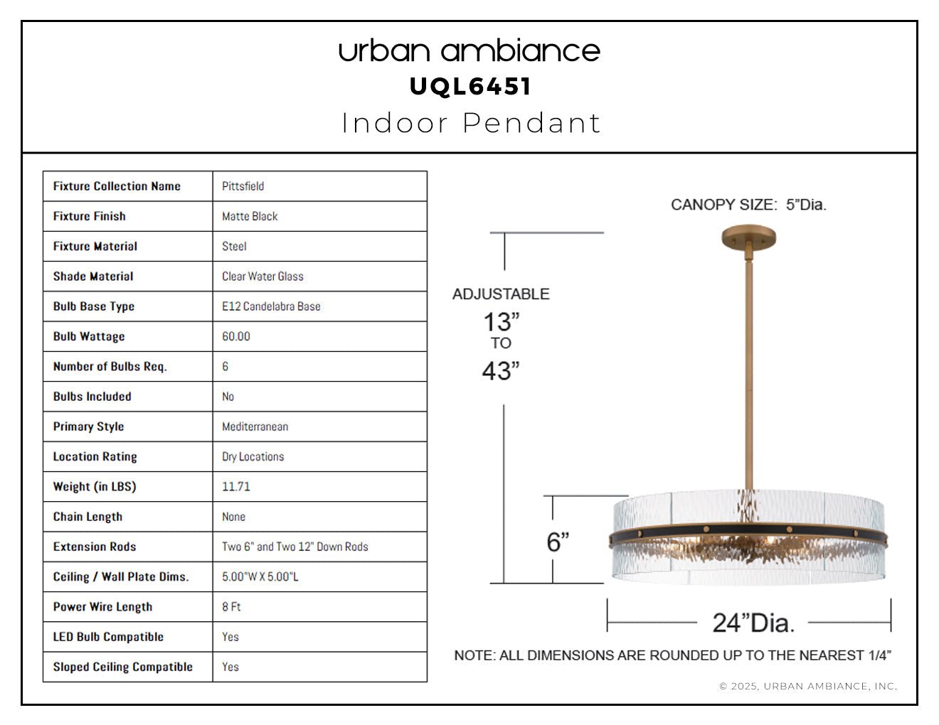 UQL6451 Mediterranean Indoor Pendant, 6.00''H x 24.00''W x 24.00''Dep, Matte Black Finish, Pittsfield Collection