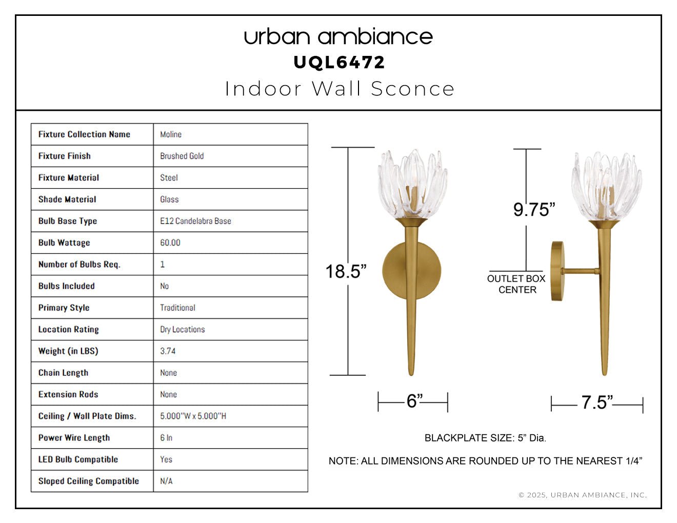 UQL6472 Traditional Indoor Wall Sconce, 18.50''H x 6.00''W x 7.50''Dep, Brushed Gold Finish, Moline Collection