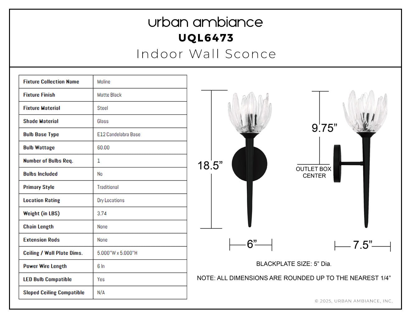 UQL6473 Traditional Indoor Wall Sconce, 18.50''H x 6.00''W x 7.50''Dep, Matte Black Finish, Moline Collection